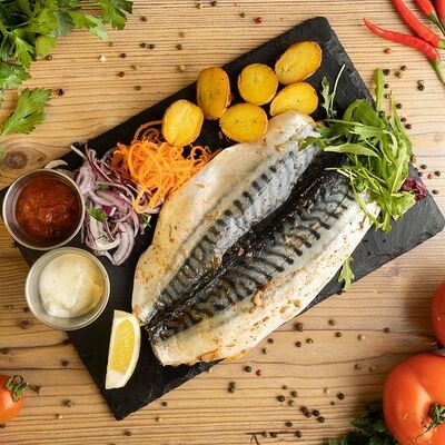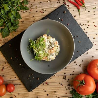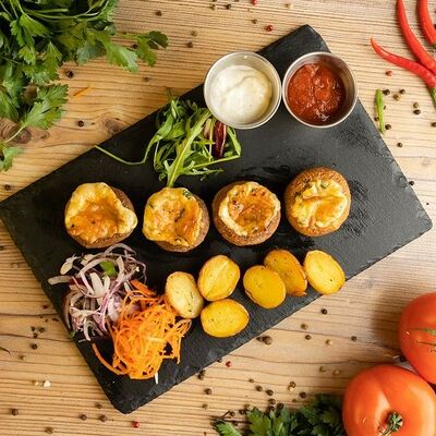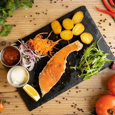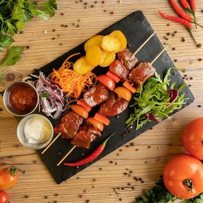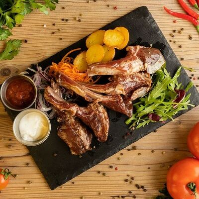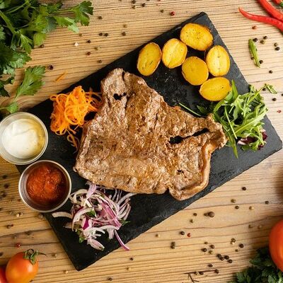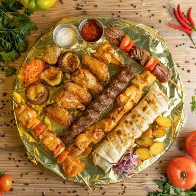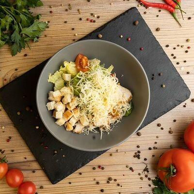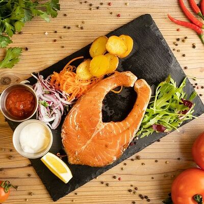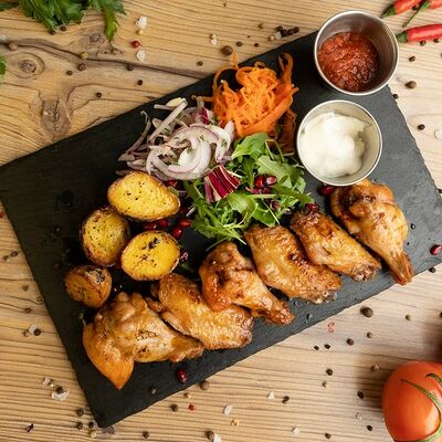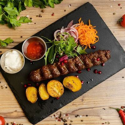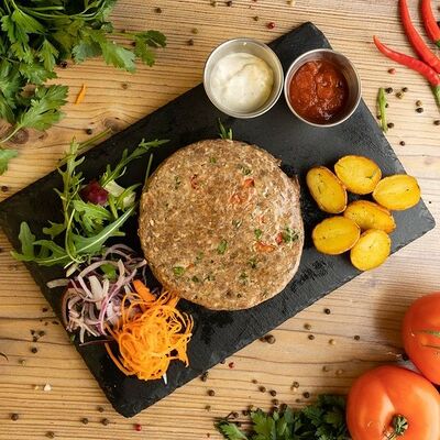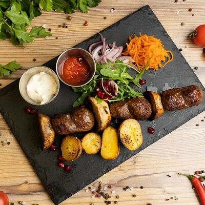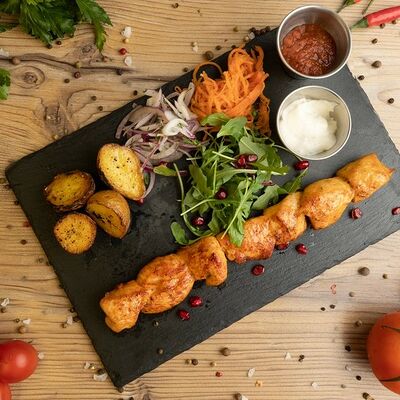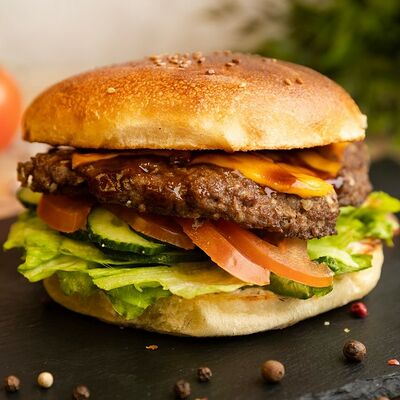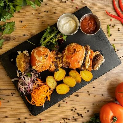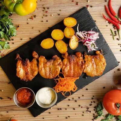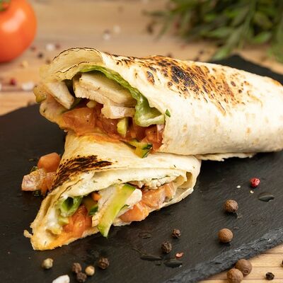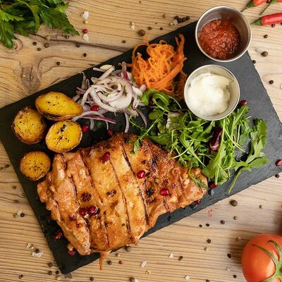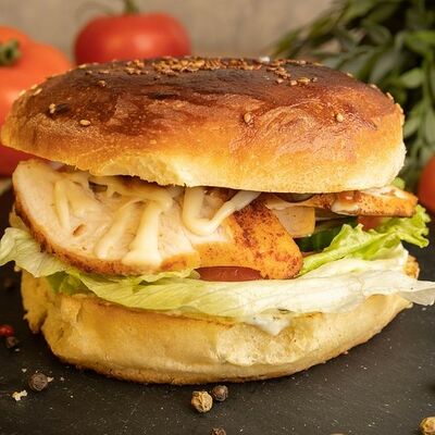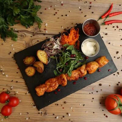Филе куриной грудки, маринад, соль, специи, гарнир, лук, салат, молочная булочка, соус белый, соус красный