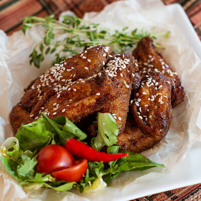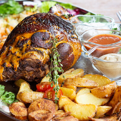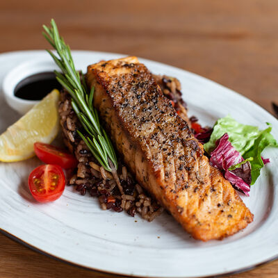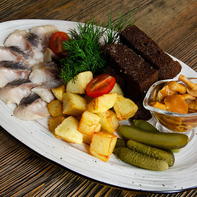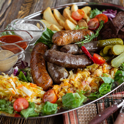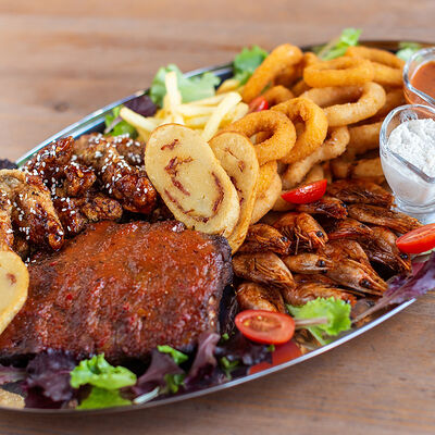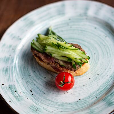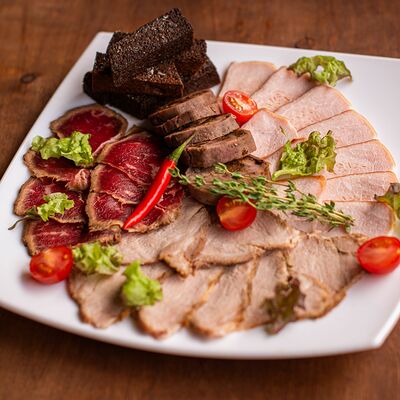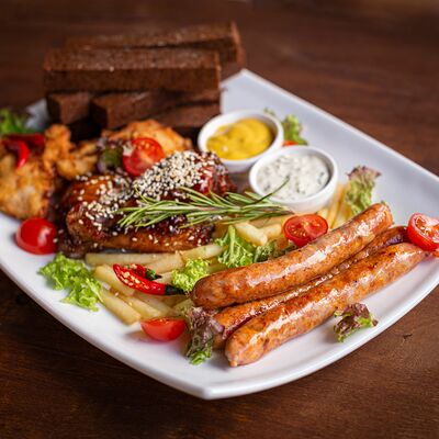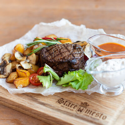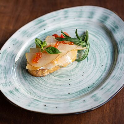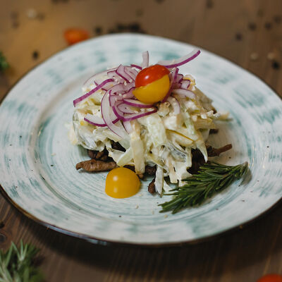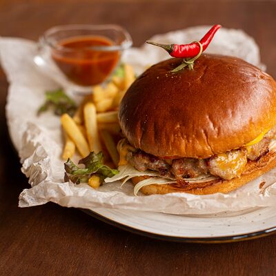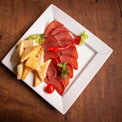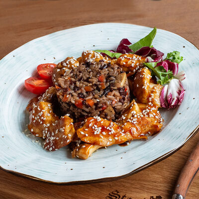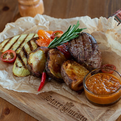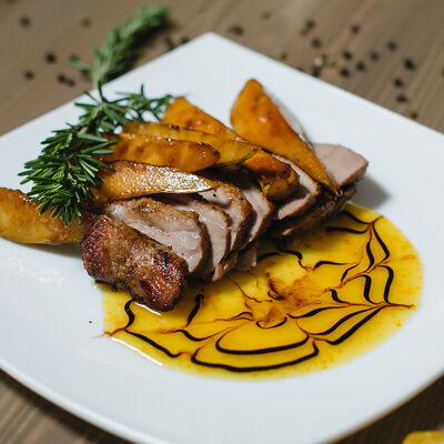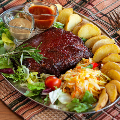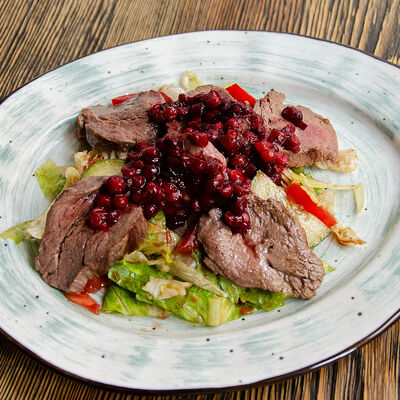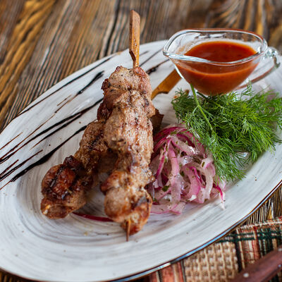 Кусочки нежной cвинoй шеи гриль, томленые при низкой температуре, маринованный красный лук, соус барбекю