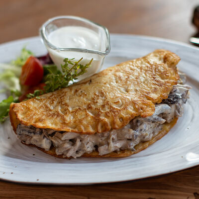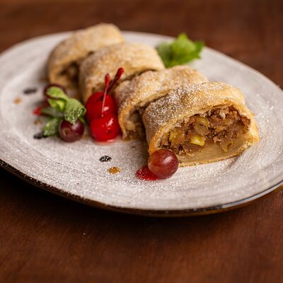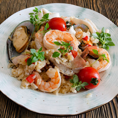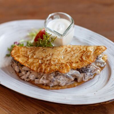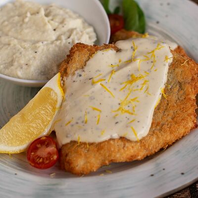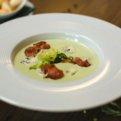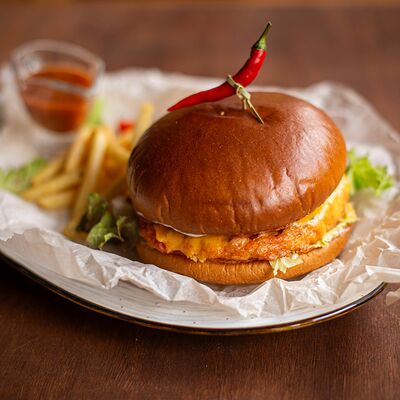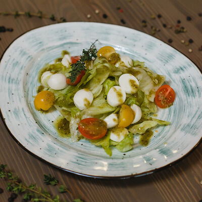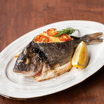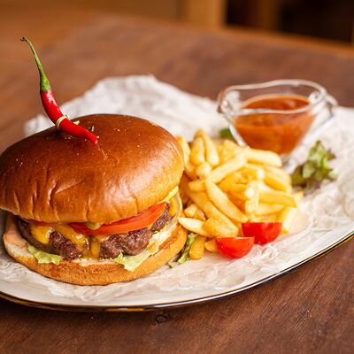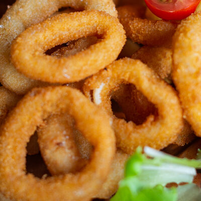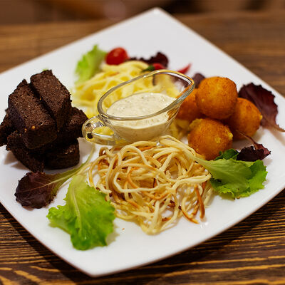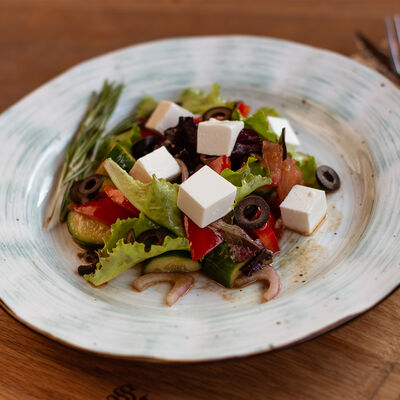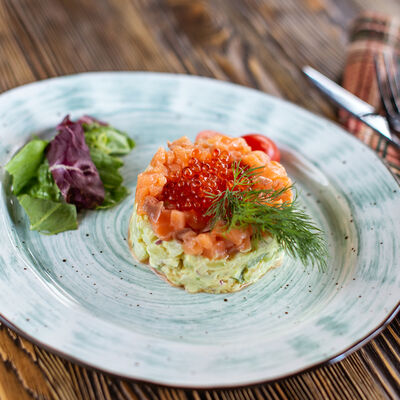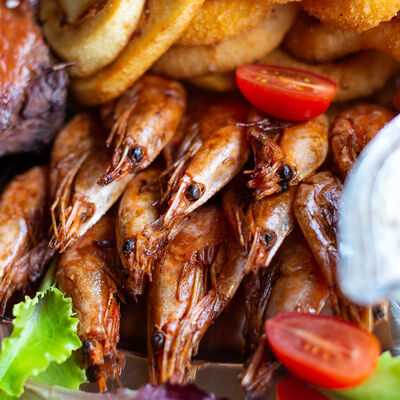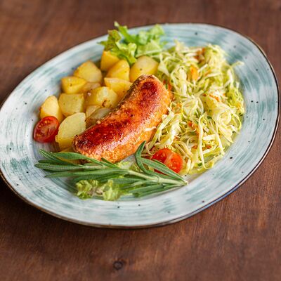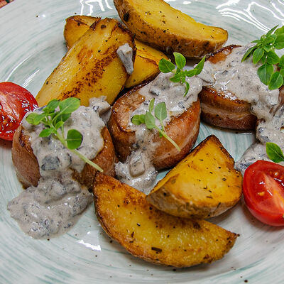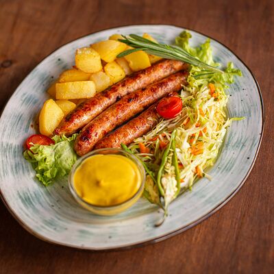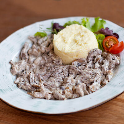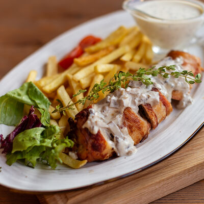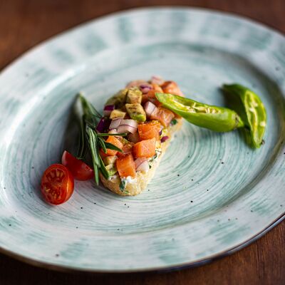 Кусочки нежной cвинoй шеи гриль, томленые при низкой температуре, маринованный красный лук, соус барбекю