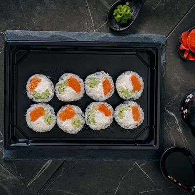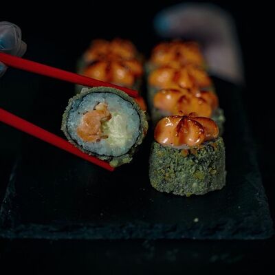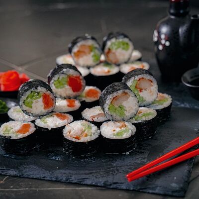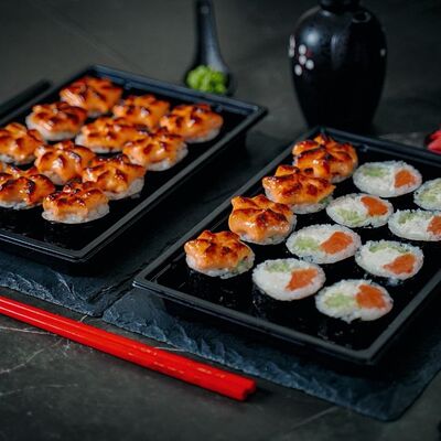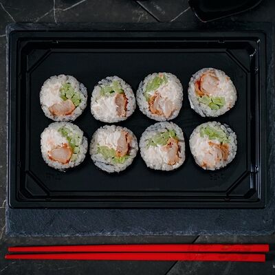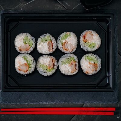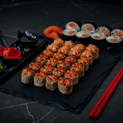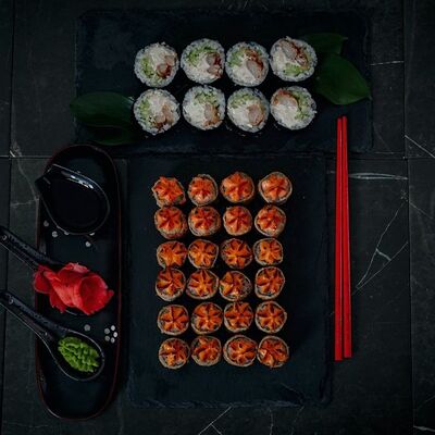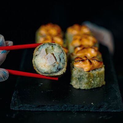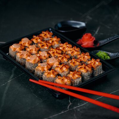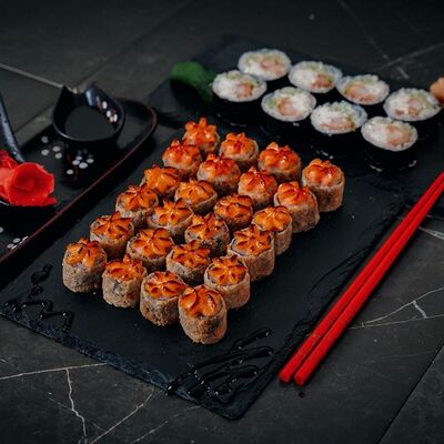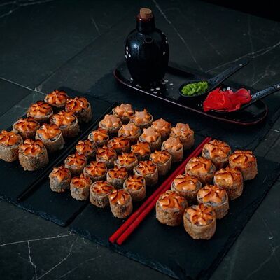 Холодный ролл (тилапия в темпуре); Калифорния классика в темпуре (крабовые палочки); Темпурный ролл с креветкой (два вида сыра и креветка на шапочке); Классика тилапия темпура (жареная тилапия) (32 шт.). Соевый соус (1-3 шт.), имбирь (1 шт.), васаби (1 шт.)