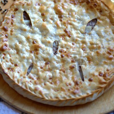 Бездрожжевое тесто, тыква, лук репчатый, грецкий орех, масло подсолнечное, масло сливочное, соль, перец, сахар-песок