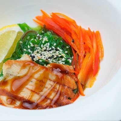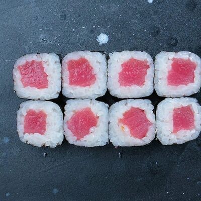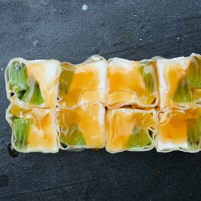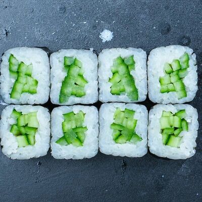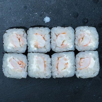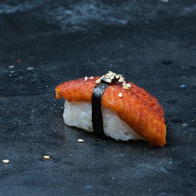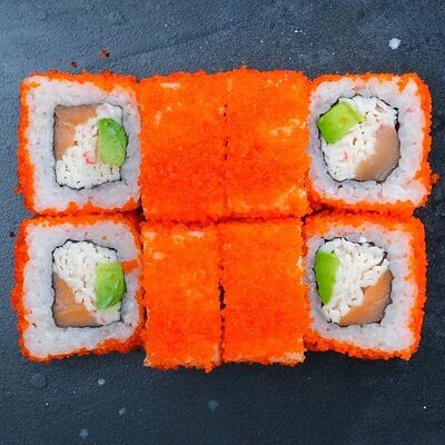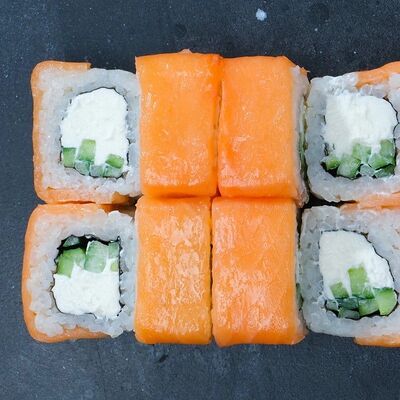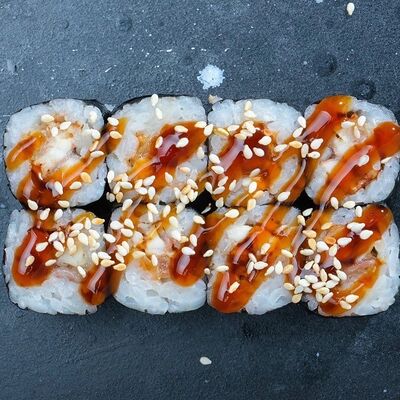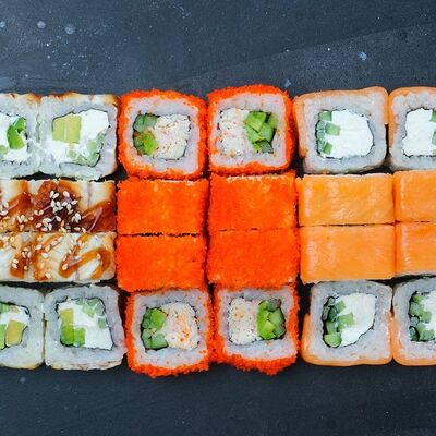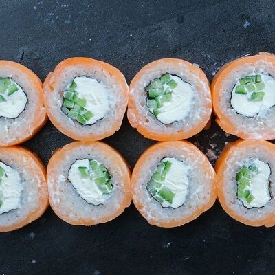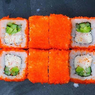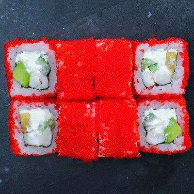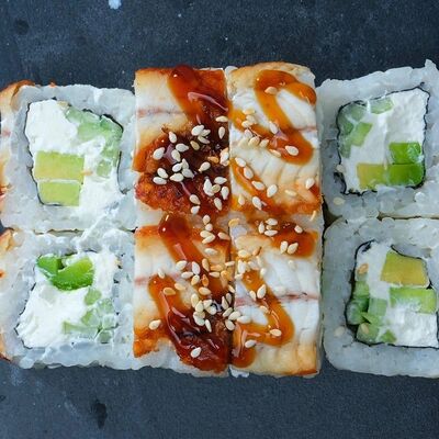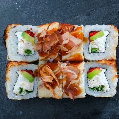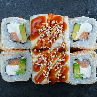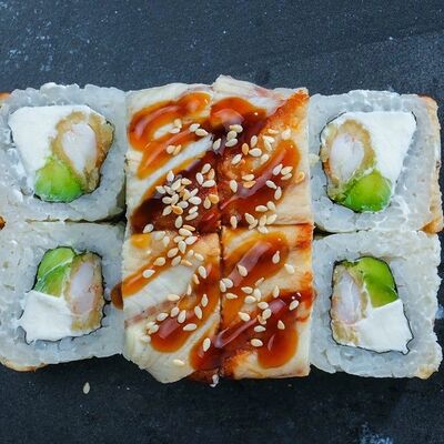 Рис, авокадо, огурец, кунжут, сыр сливочный, соус унаги, угорь копчёный, водоросли нори