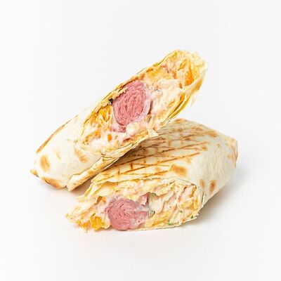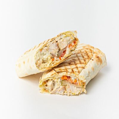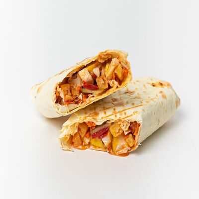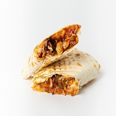 Шашлык из курицы, жареный бекон, соус BBQ, картошка фри, сливочный соус, маринованный огурец, помидор, капуста, хрустящий лаваш