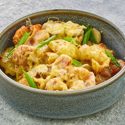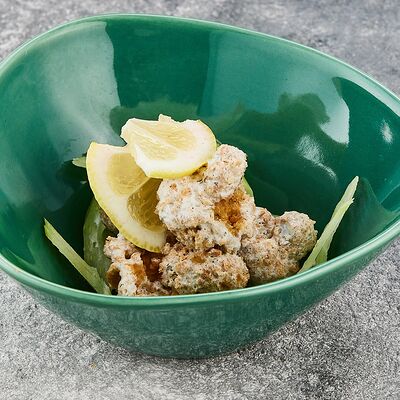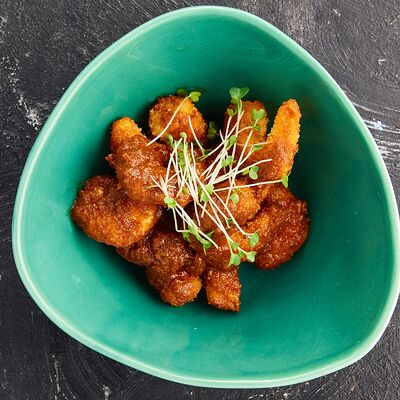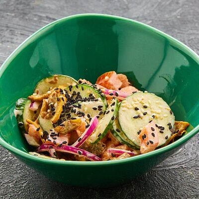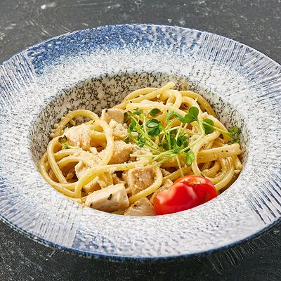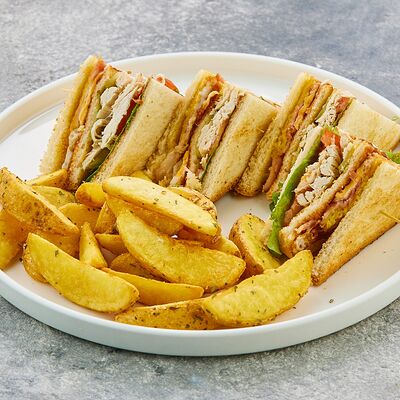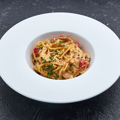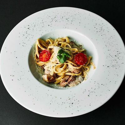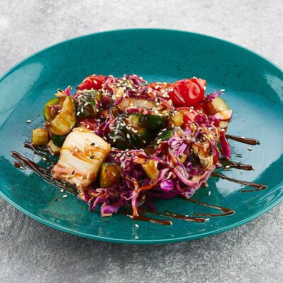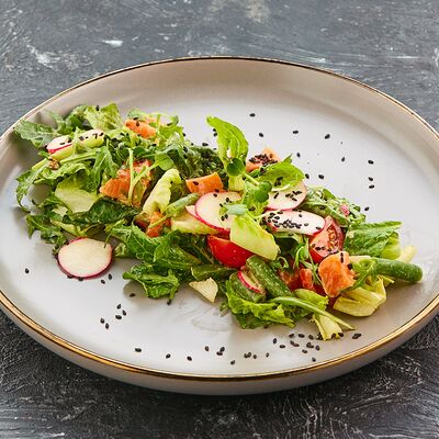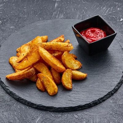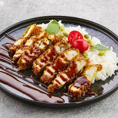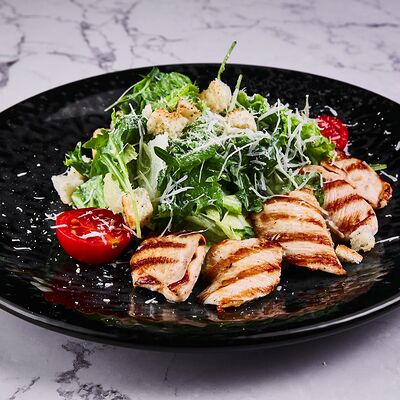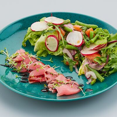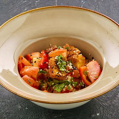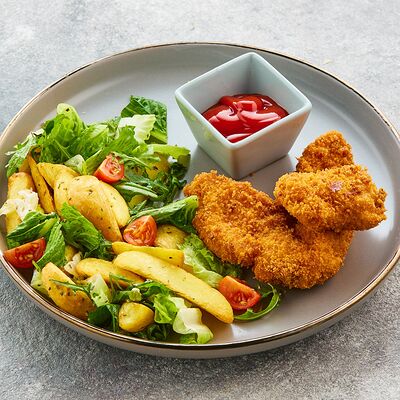 Свиная вырезка, микс-салат, картофель айдахо, оливковое масло, томаты черри, редис, панировка, прованские травы, соус на выбор