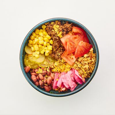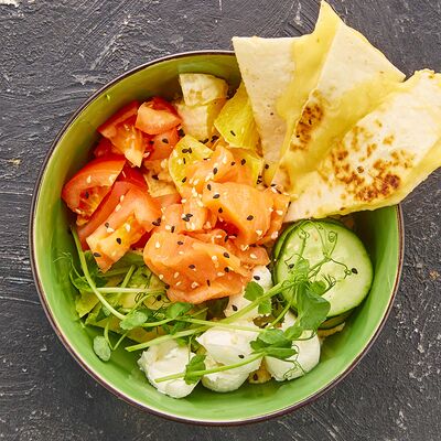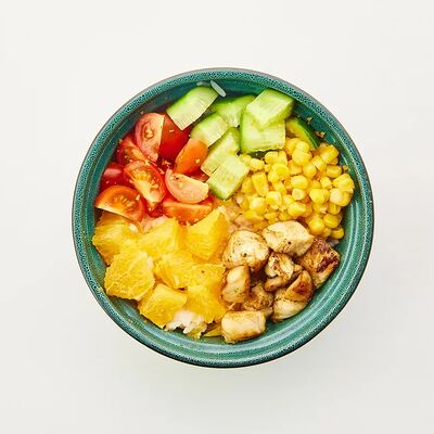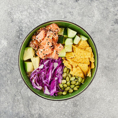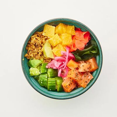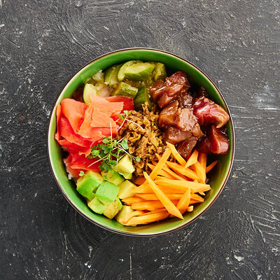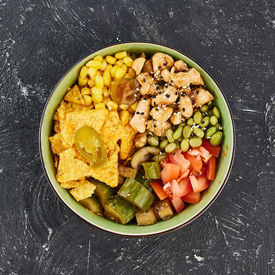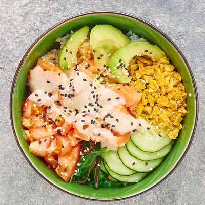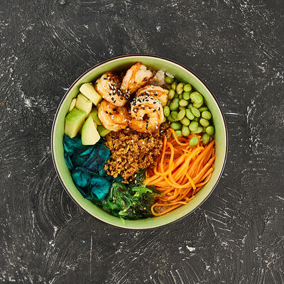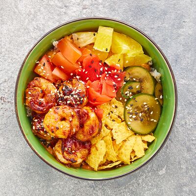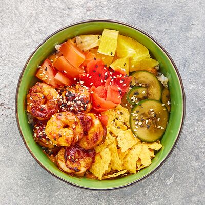 Тигровые креветки в соусе сладкий чили, рис для суши, соус сладкий чили, авокадо, водоросли чука, морковь, маринованный имбирь, бобы эдамаме, лук фри, кунжут