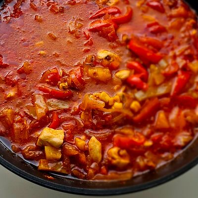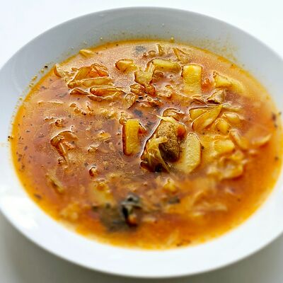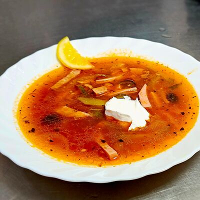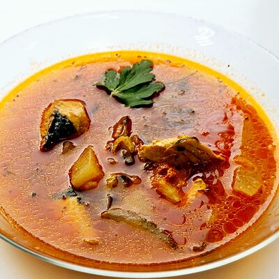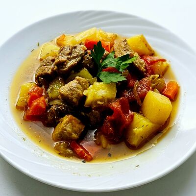 Говядина, картофель, лук, перец болгарский, морковь, огурец маринованный, специи