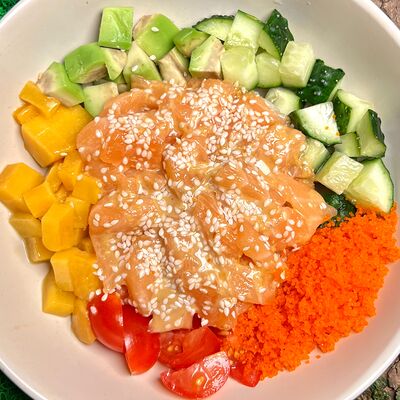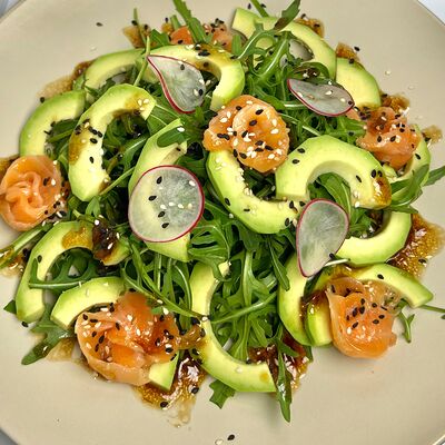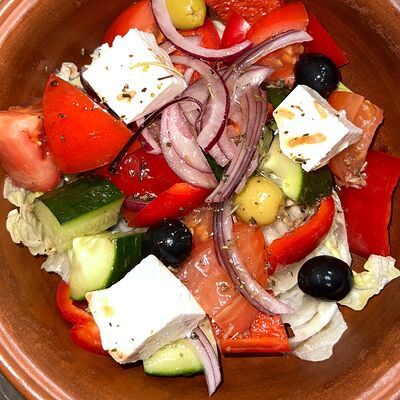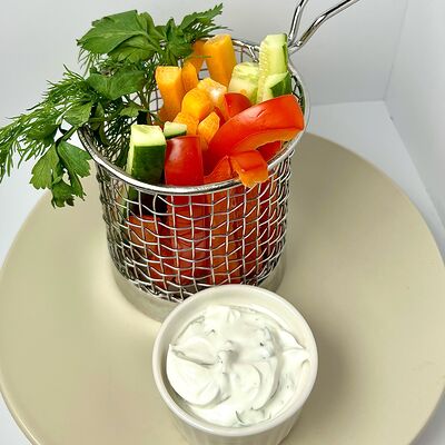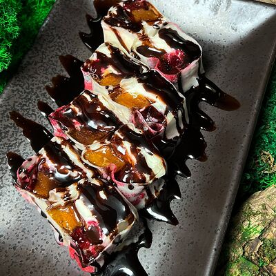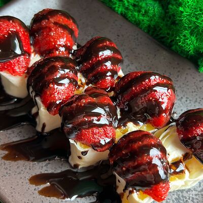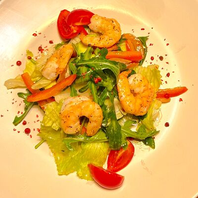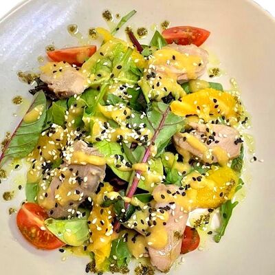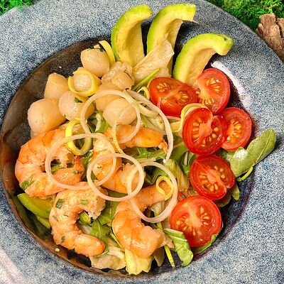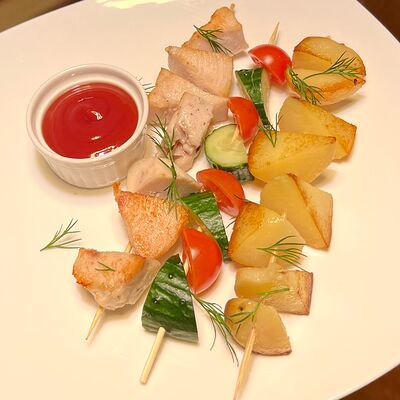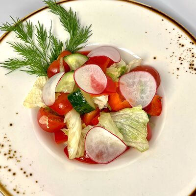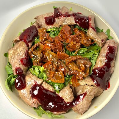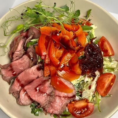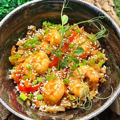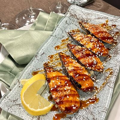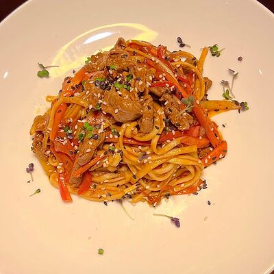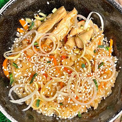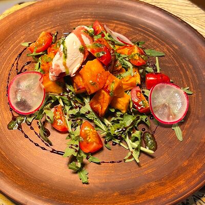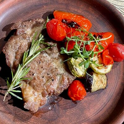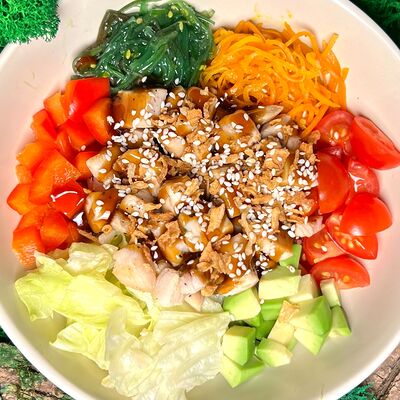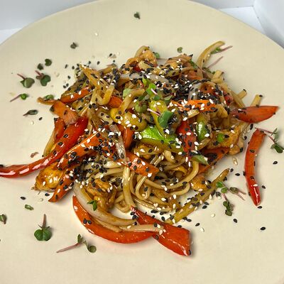 Баклажаны, болгарский перец, помидоры черри, красный лук, чеснок в соусе терияки и сладком соусе чили с добавлением кинзы