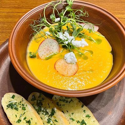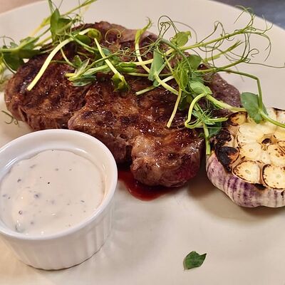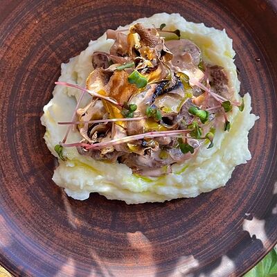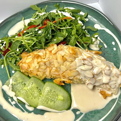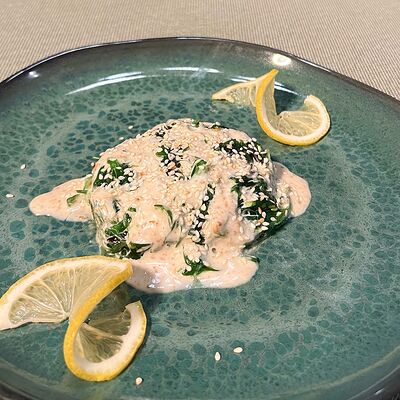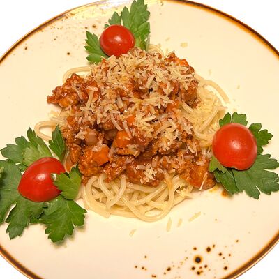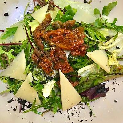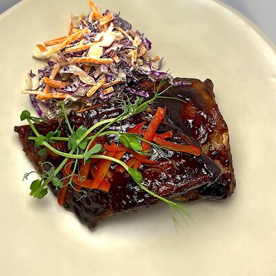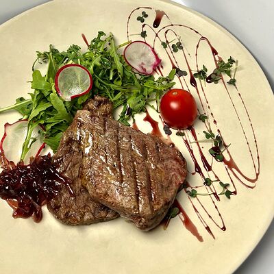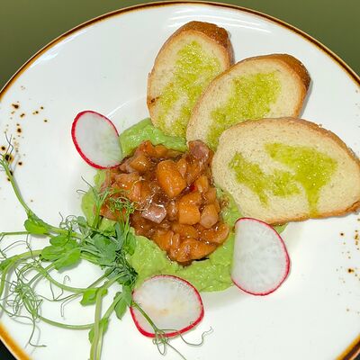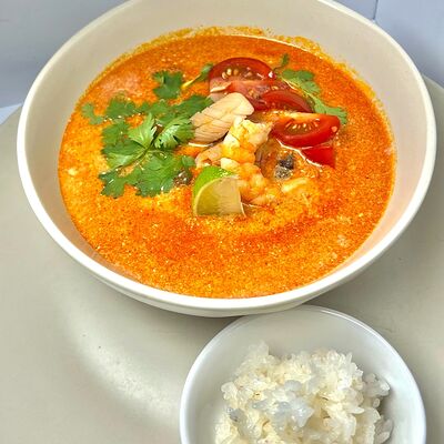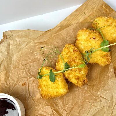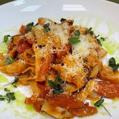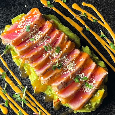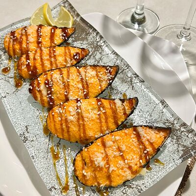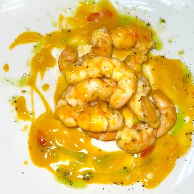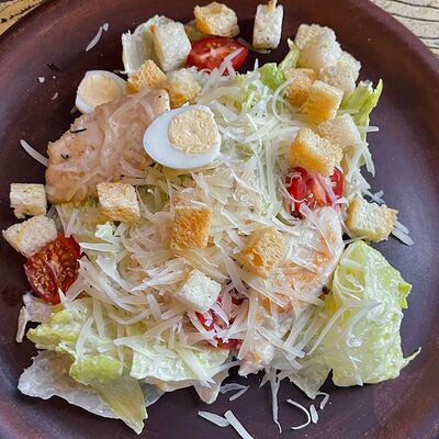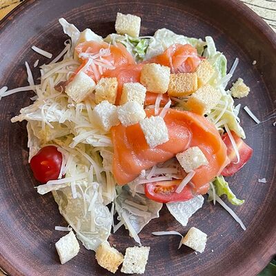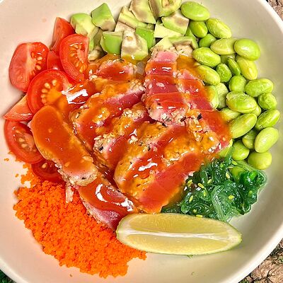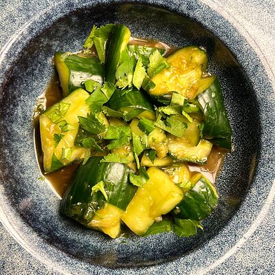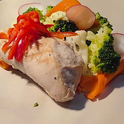 Баклажаны, болгарский перец, помидоры черри, красный лук, чеснок в соусе терияки и сладком соусе чили с добавлением кинзы