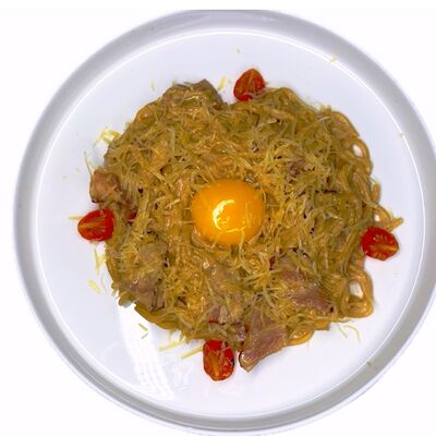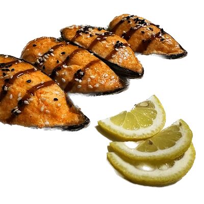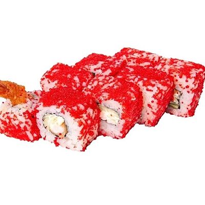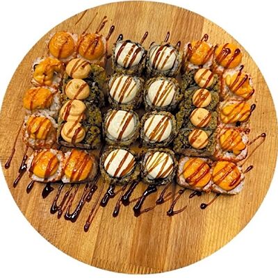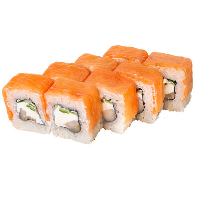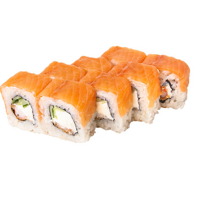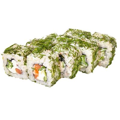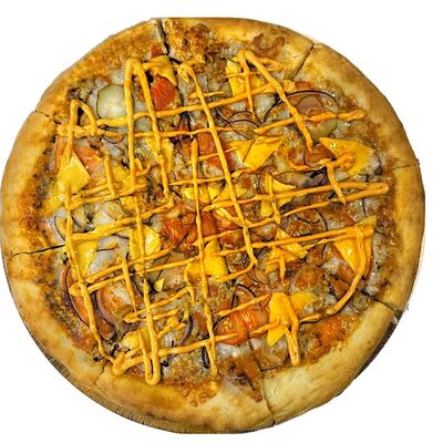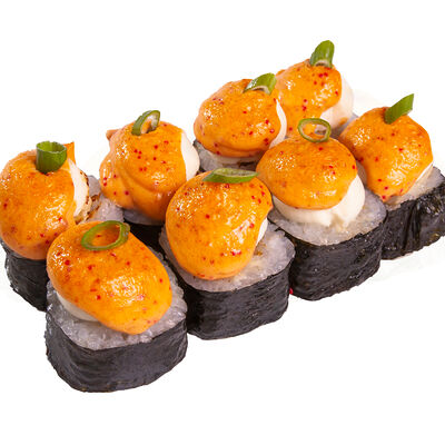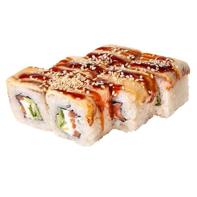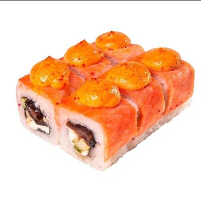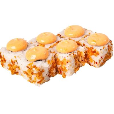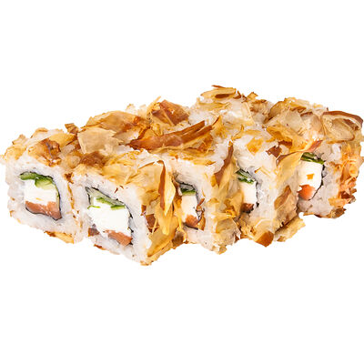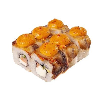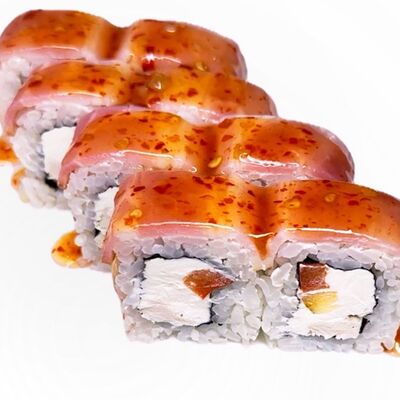 Рис, нори, куриное филе, бекон, сливочный сыр, сладкий чили, спайси соус, соевый соус, васаби, имбирь (8 шт.)