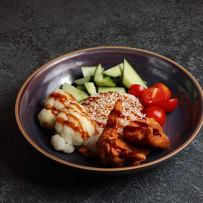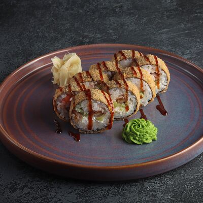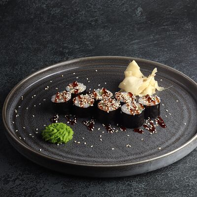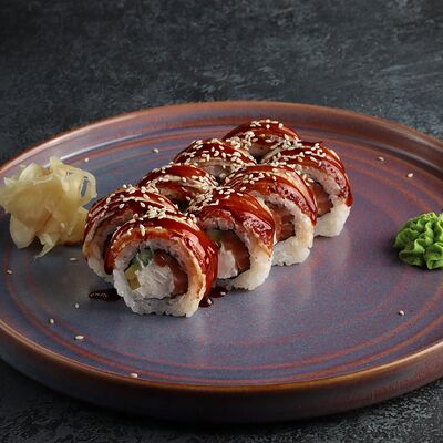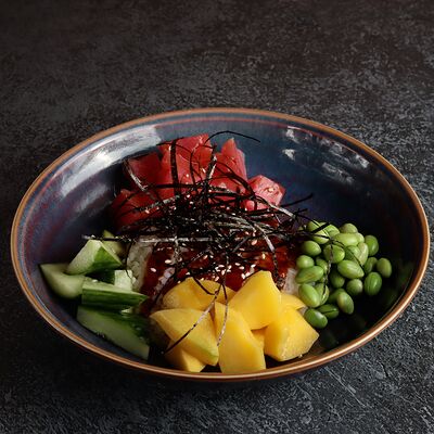 Рис, манго, вырезка тунца, водоросли нори, соевые бобы, огурец, соус терияки, кунжут