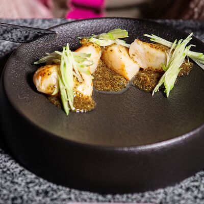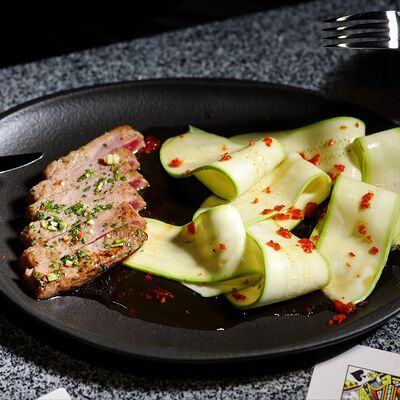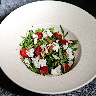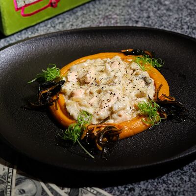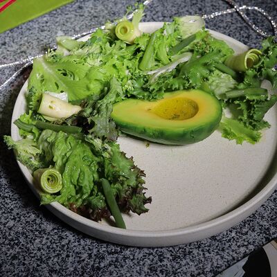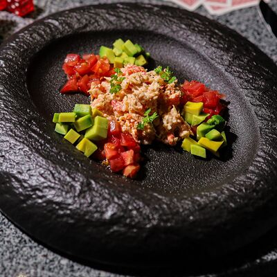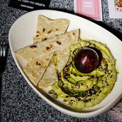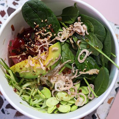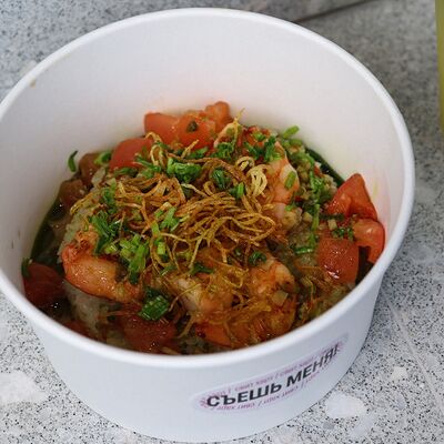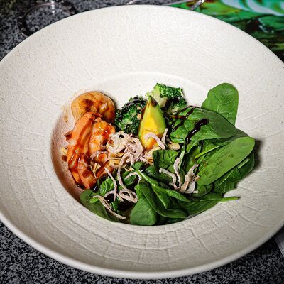 Лосось, рис, авокадо, бобы эдамаме, фуриканэ, салат чука, соус гамадари
