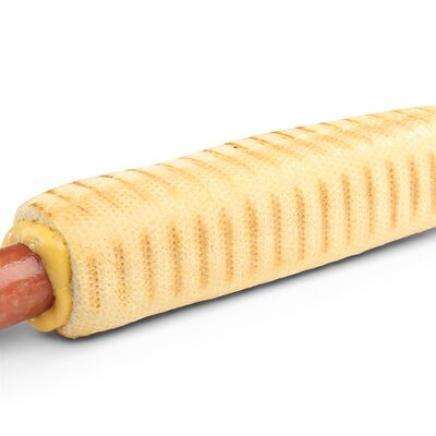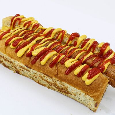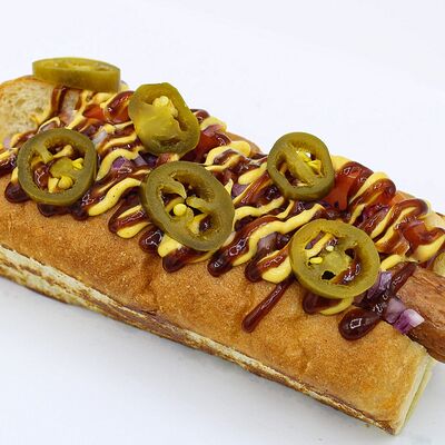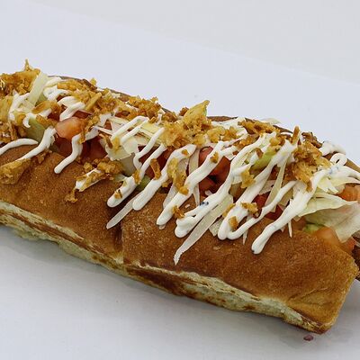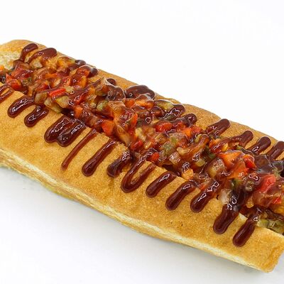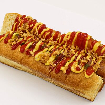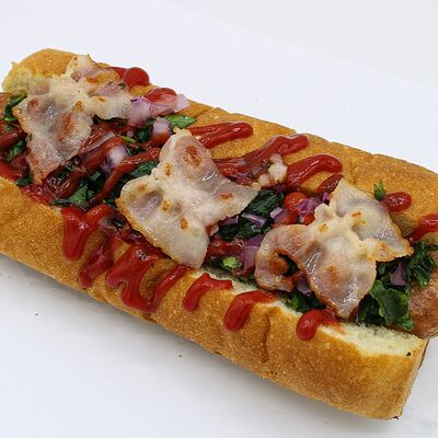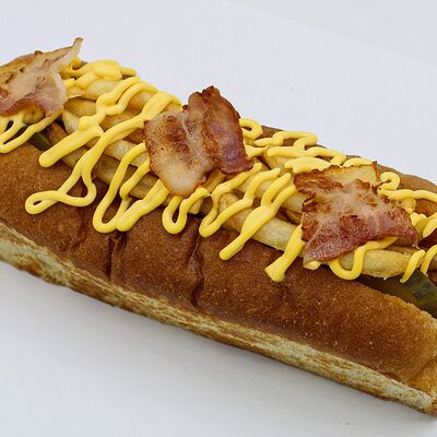 Картофельная булочка, сосиска, красный лук, бекон, чимичурри, кетчуп