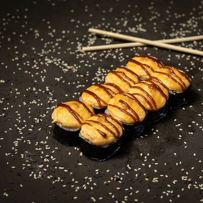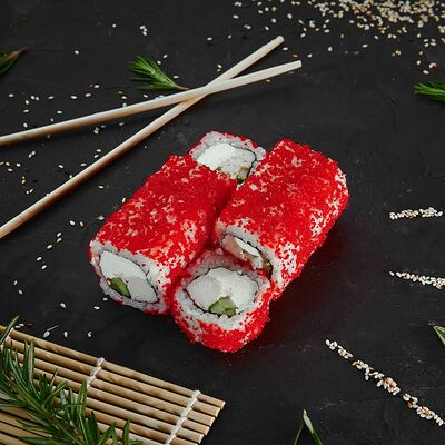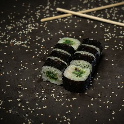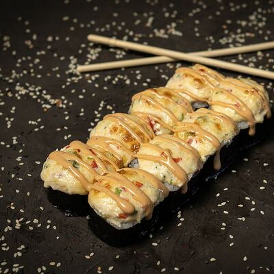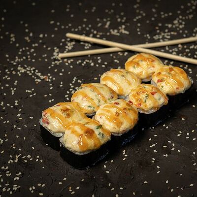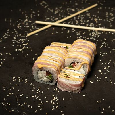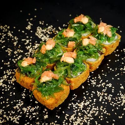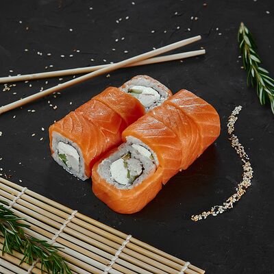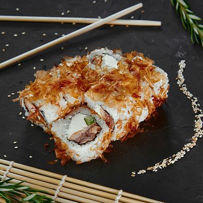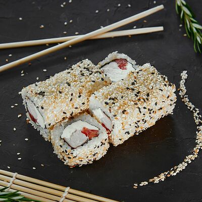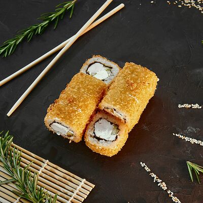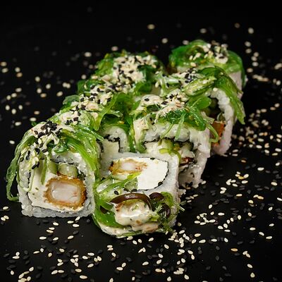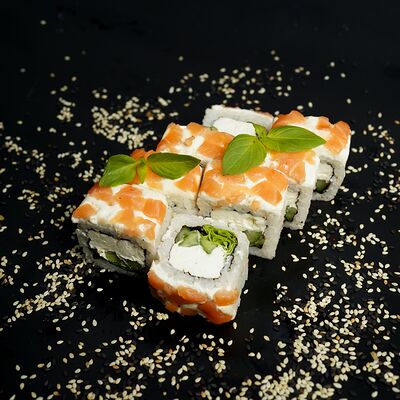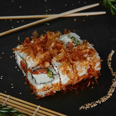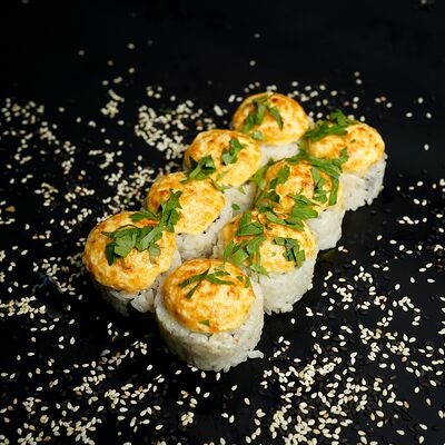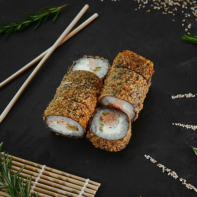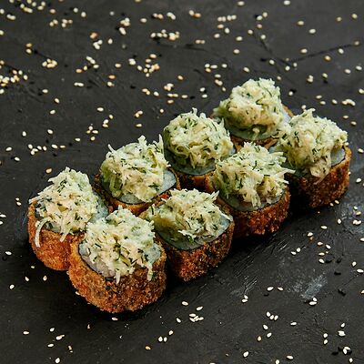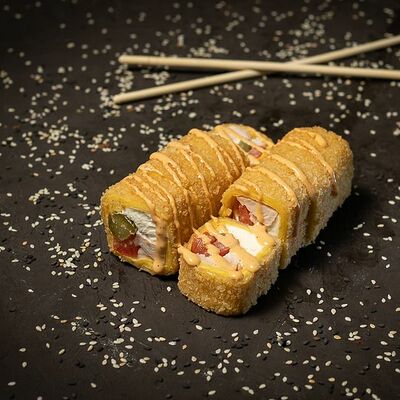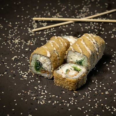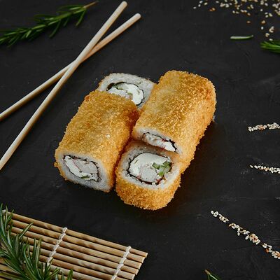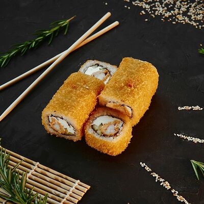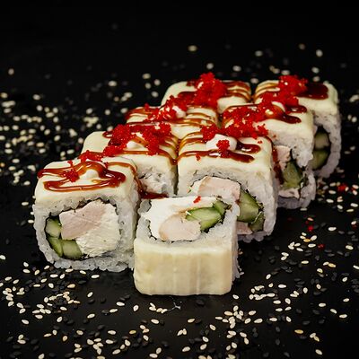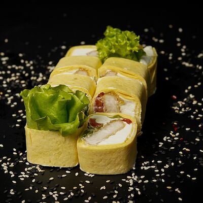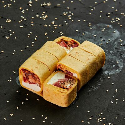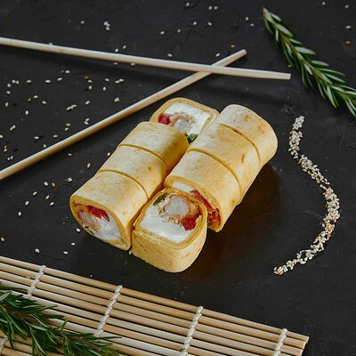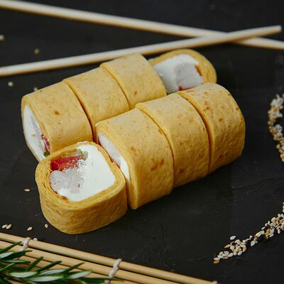 Лепешка сырная, сливочный сыр, наггетсы куриные, лист салата, помидор. Имбирь, васаби, соевый соус приобретается отдельно