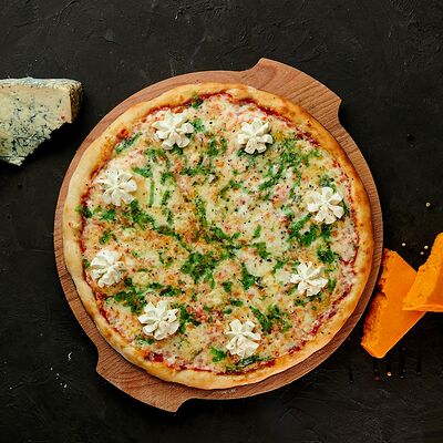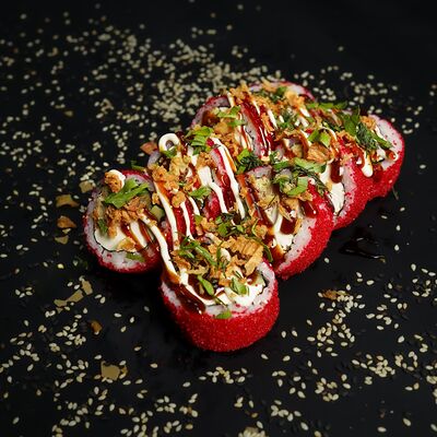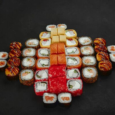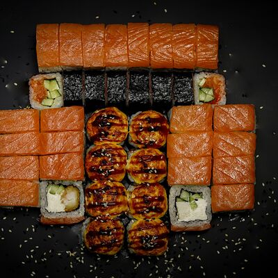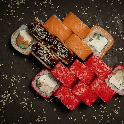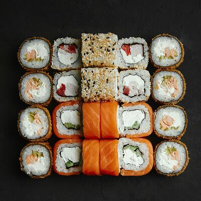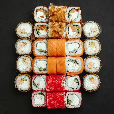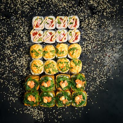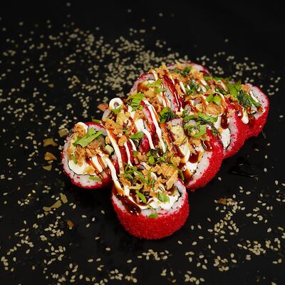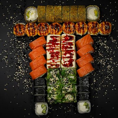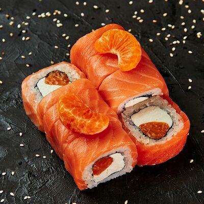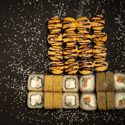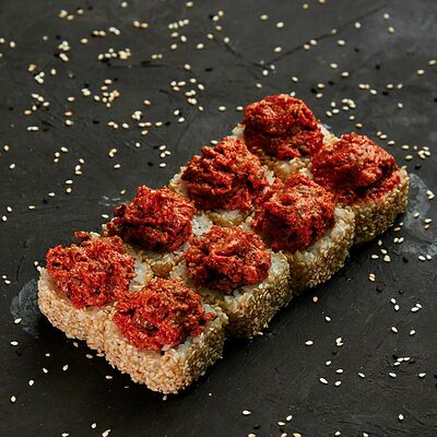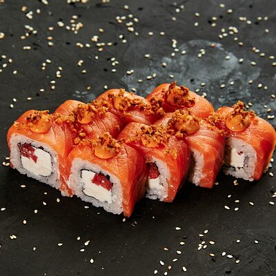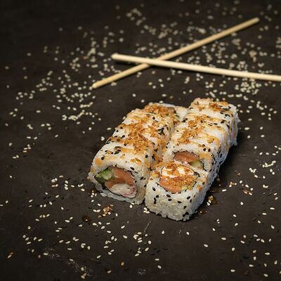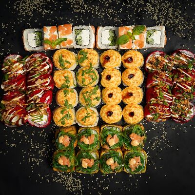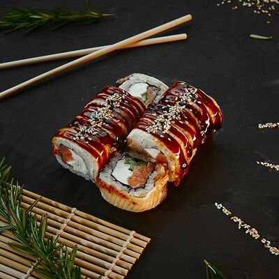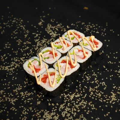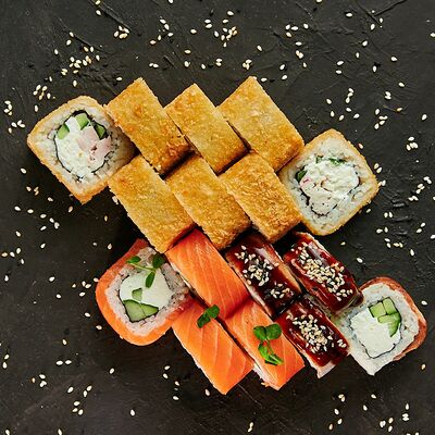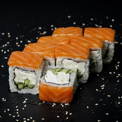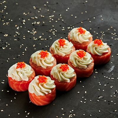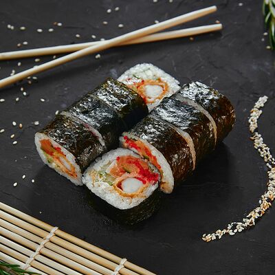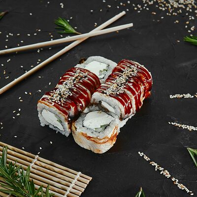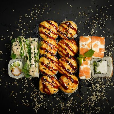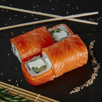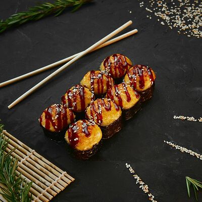 Лепешка сырная, сливочный сыр, наггетсы куриные, лист салата, помидор. Имбирь, васаби, соевый соус приобретается отдельно