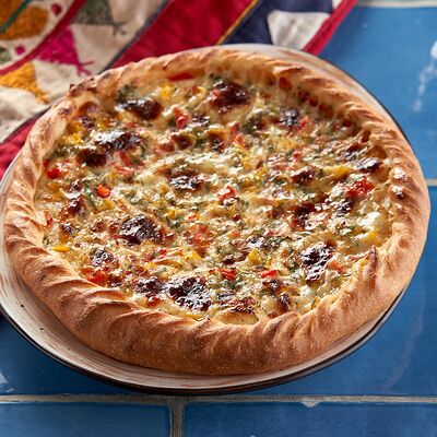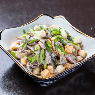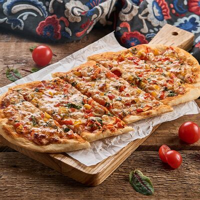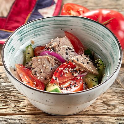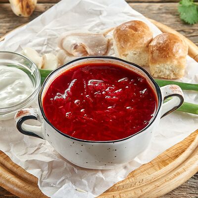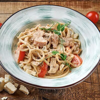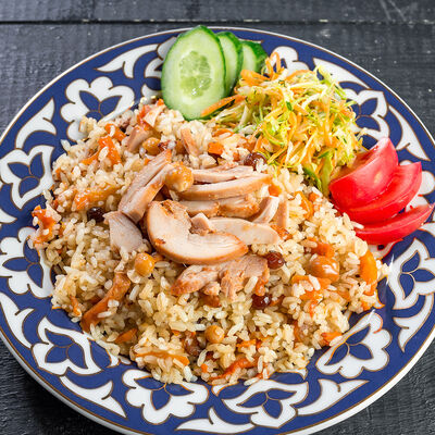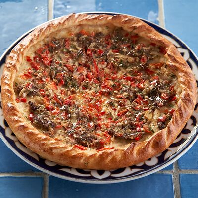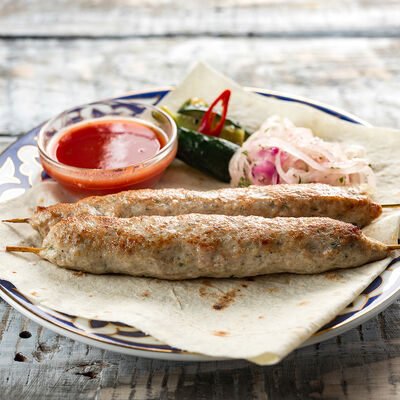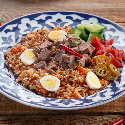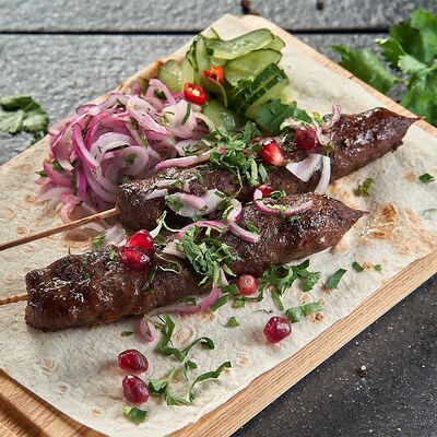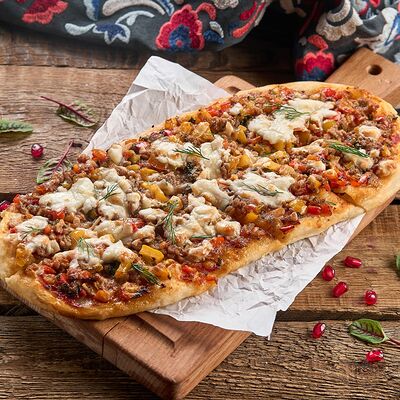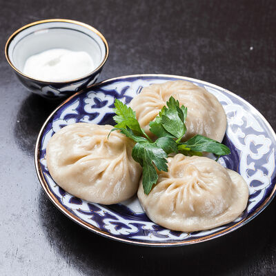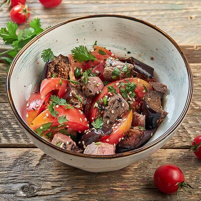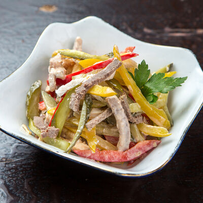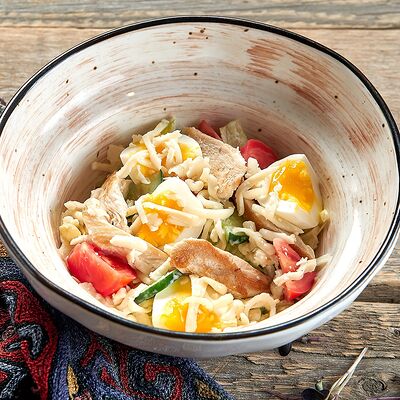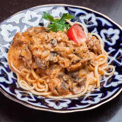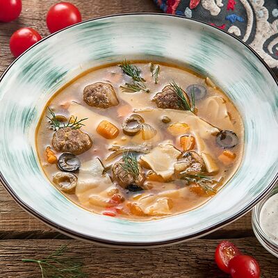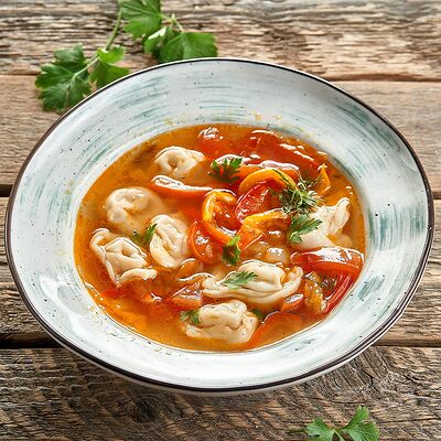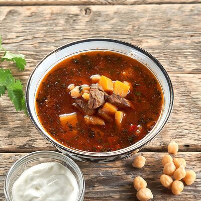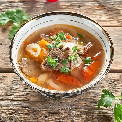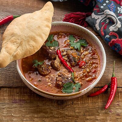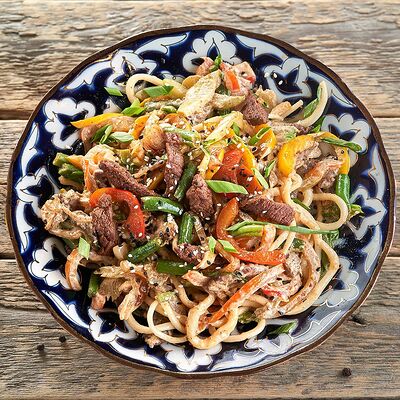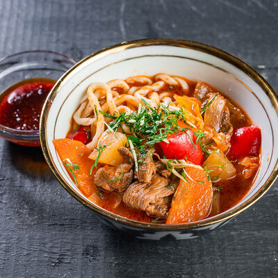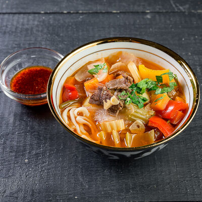 Домашняя лапша, баранина, стручковая фасоль, редис, пекинская капуста, болгарский перец, помидоры, кинза, сельдерей, подается с острой аджикой