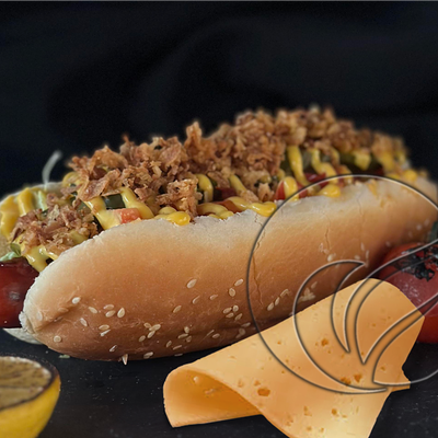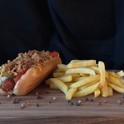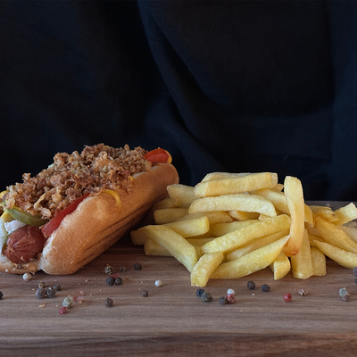 Сочная говяжья колбаска, обжаренная на гриле, в хрустящей французской булочке с добавлением лука фри. Особый пикантный вкус блюду придает фирменный соус. Пищевая ценность на 100г: Белки 7 Жиры 9 Углеводы 19 Калорийность 235