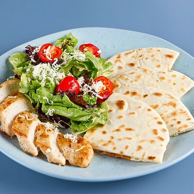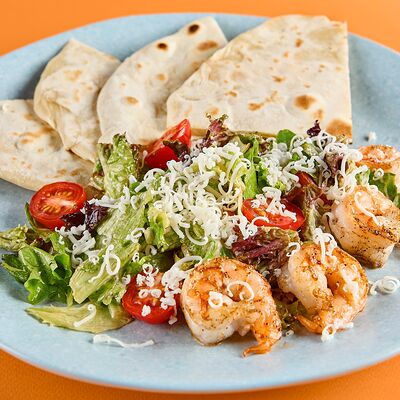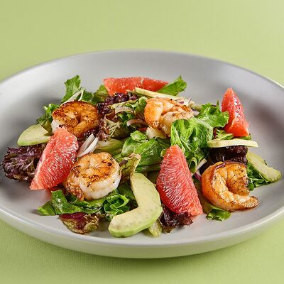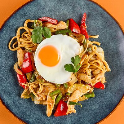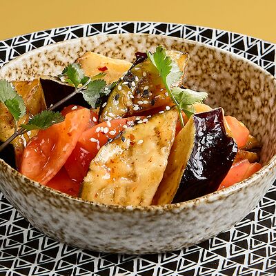 Стейк филе лосося, обжаренный на гриле, болгарский перец, шампиньоны, цукини, красный лук, томаты черри