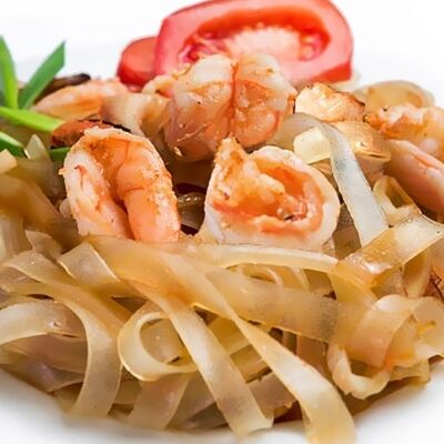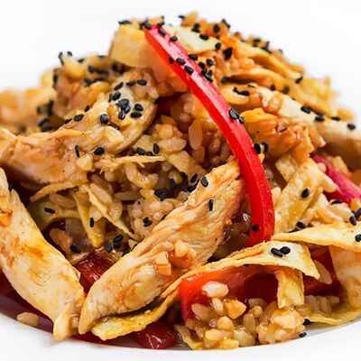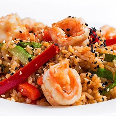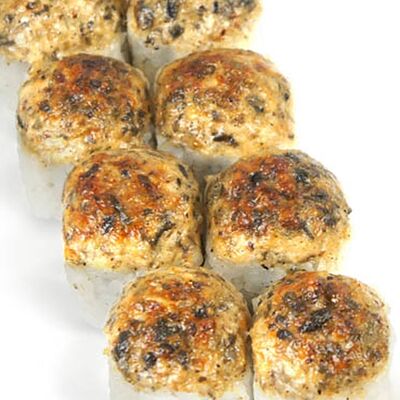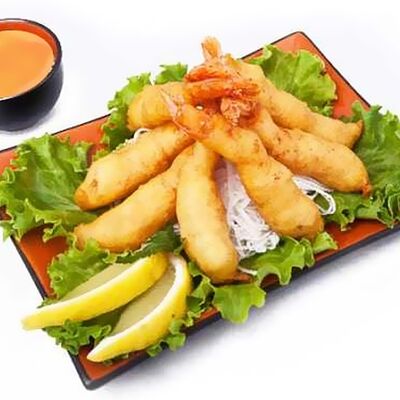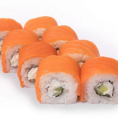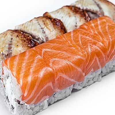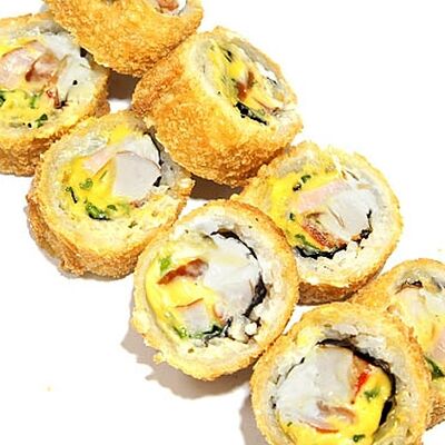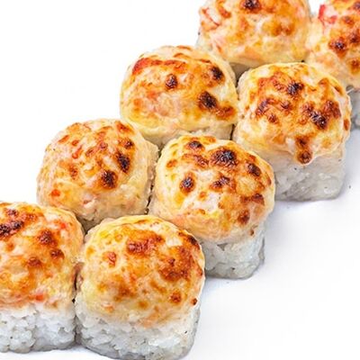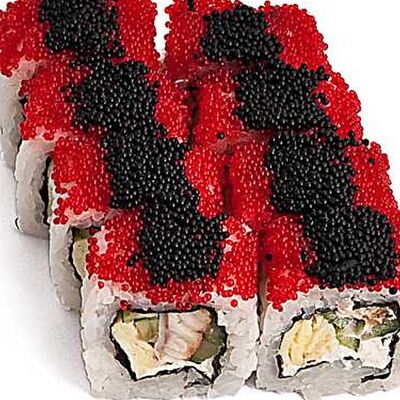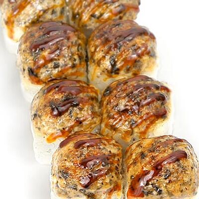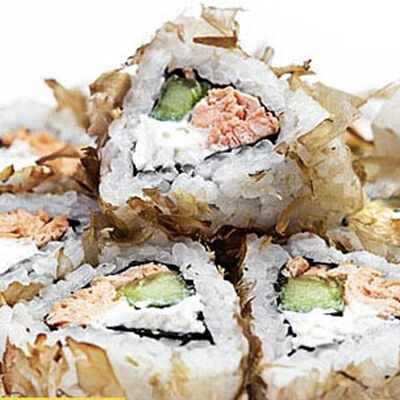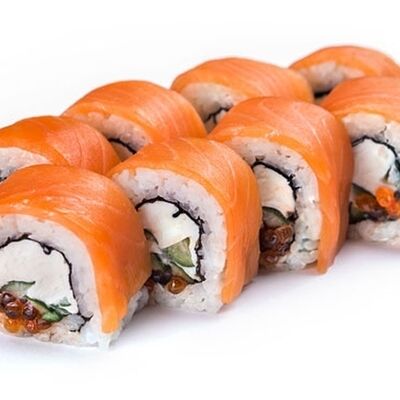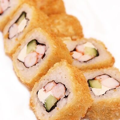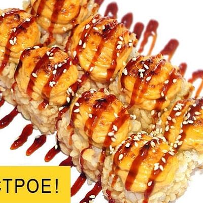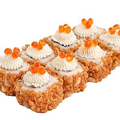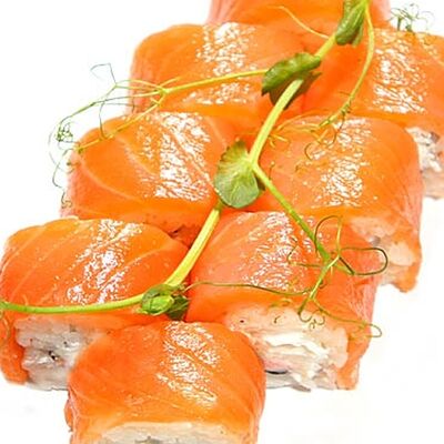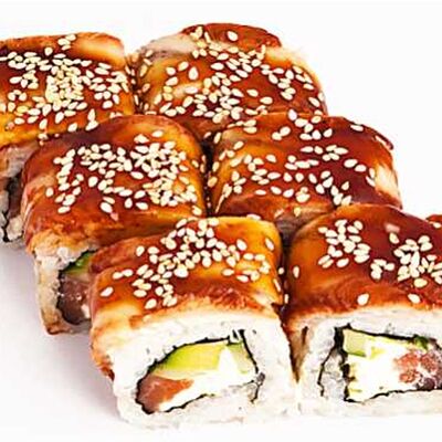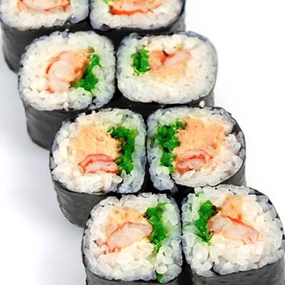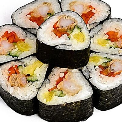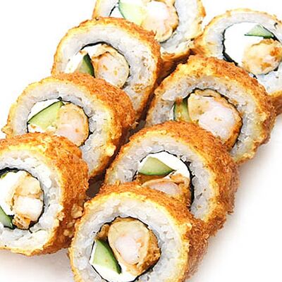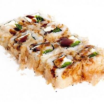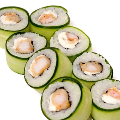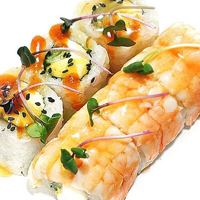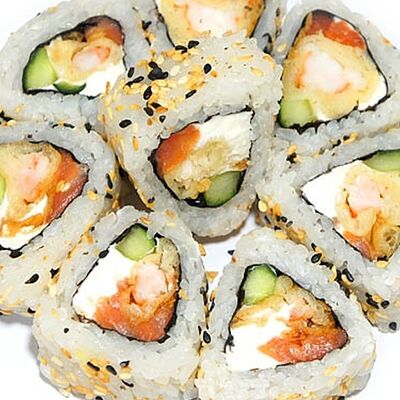 Тигровые маринованные креветки, огурец, сыр Филадельфия, сыр Хохланд, кунжут, соус манго-халапеньо, соус пад тай, соус унаги, микрозелень, водоросли нори