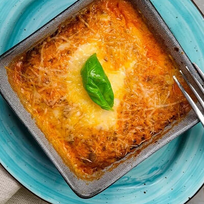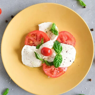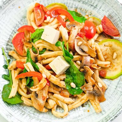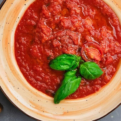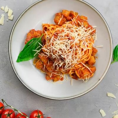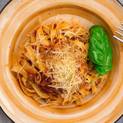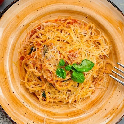 Паста с томатным соусом, базиликом и тёртым сыром