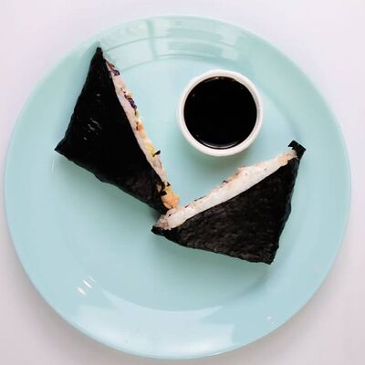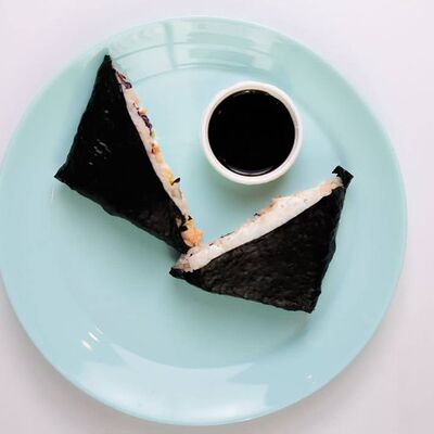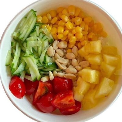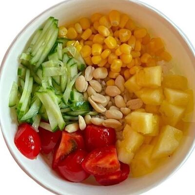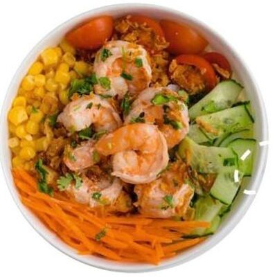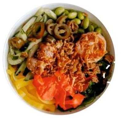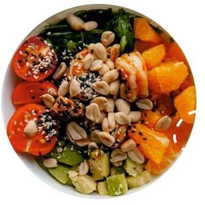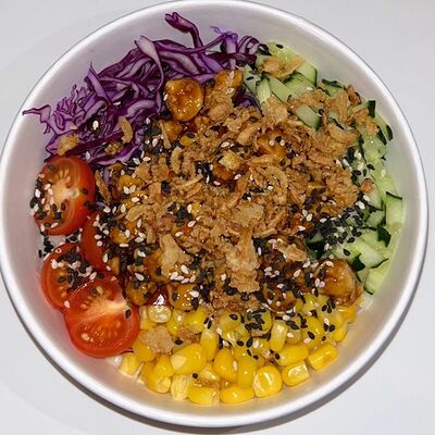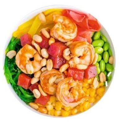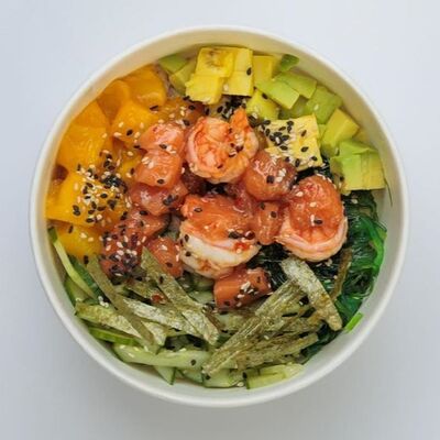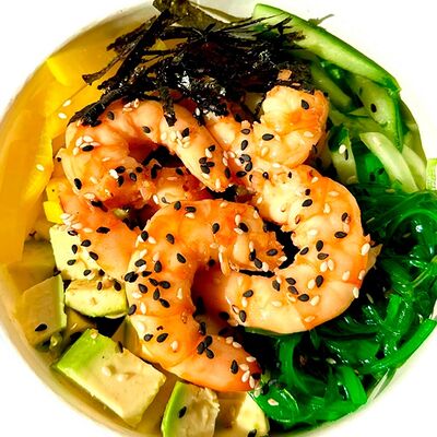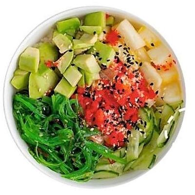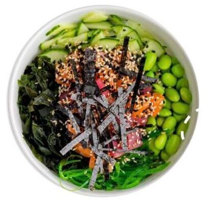 Киноа, острый азиатский соус, лосось и тунец (60 г), соевый соус с кунжутным маслом, вакаме, огурец, бобы, чука, нори, кунжут