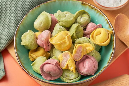 фарш: филе куриное, королевские креветки, лук, перец, соль, мука, чернила каракатицы, репчатый лук, шпинат, куркума, свекла!