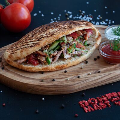 Лаваш, курица, огурцы маринованные, морковь по-корейски, перец халапеньо, соус чили, соус сметанный
