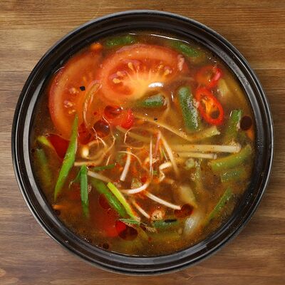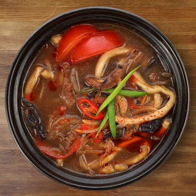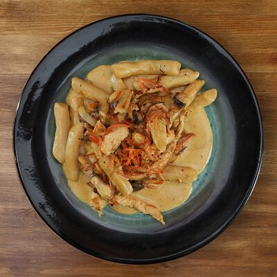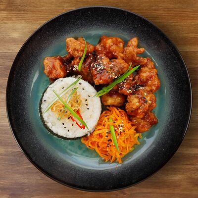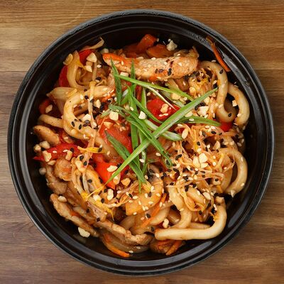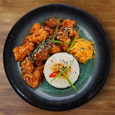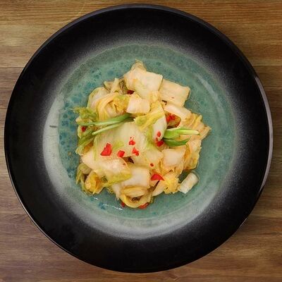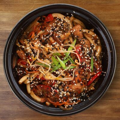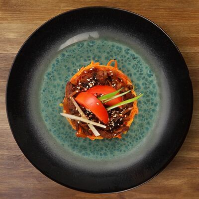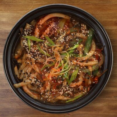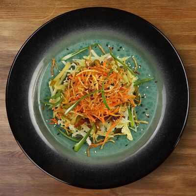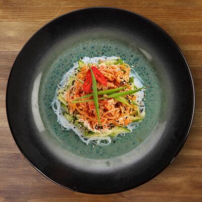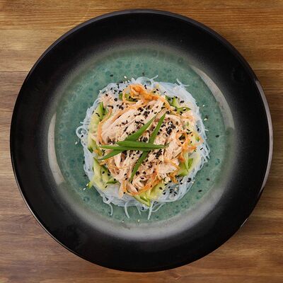 Острая Курица бань- бань В основе крахмальная лапша фунчёза, и свежий огурчик, куриная грудка Бань бань - это белое мясо, отваренное с добавлением специй, Побитая и разделённая на волокна. Изюминка салата - заправка: остро-солёная, кисло-сладкая. С добавлением кунжута. Это лёгкая, освежающая закуска