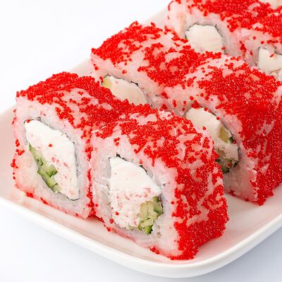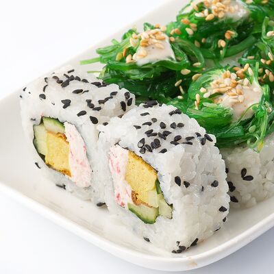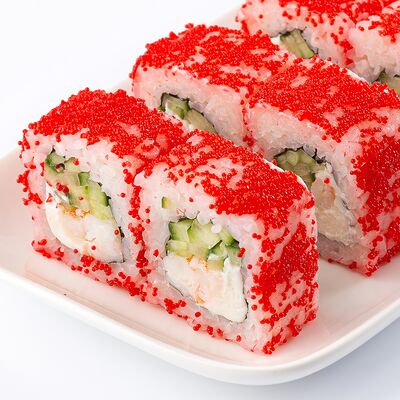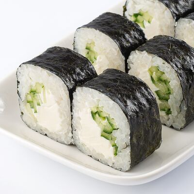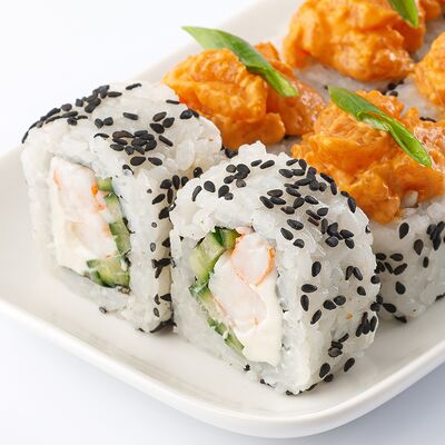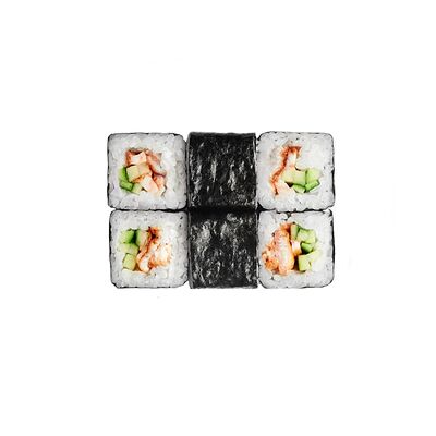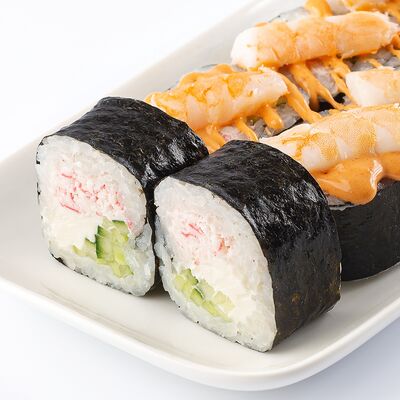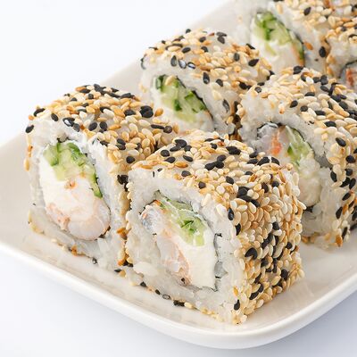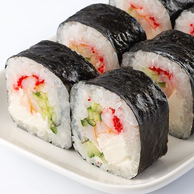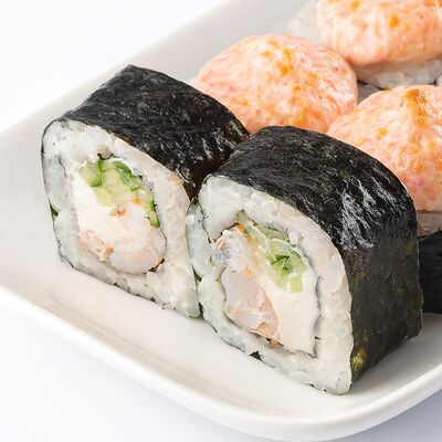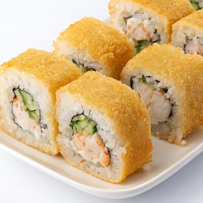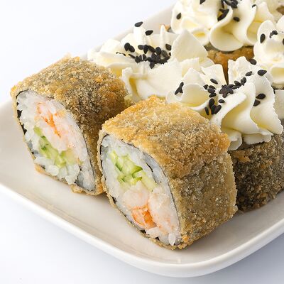 Тигровая креветка, сыр cremette, свежий огурчик, кляр, сухари панко, рис, нори