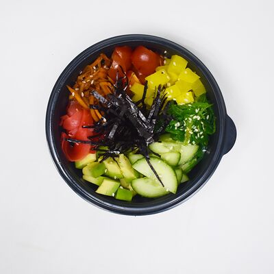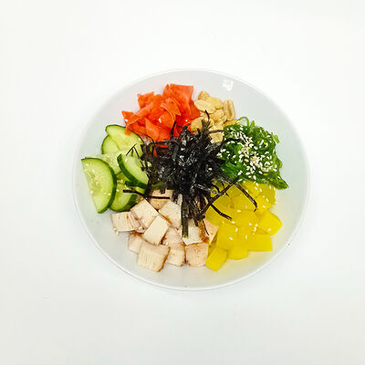 Лосось, рис, азиатский соус, огурец, авокадо, водоросли чука, корейская морковь, маринованный имбирь, нори