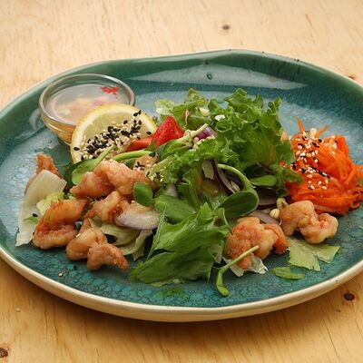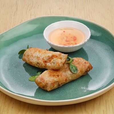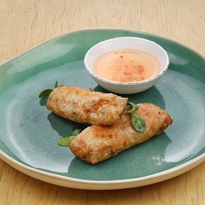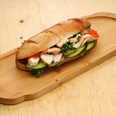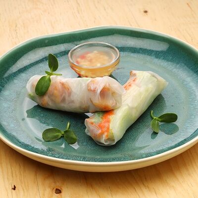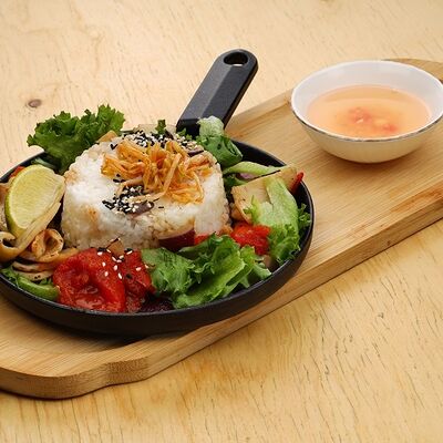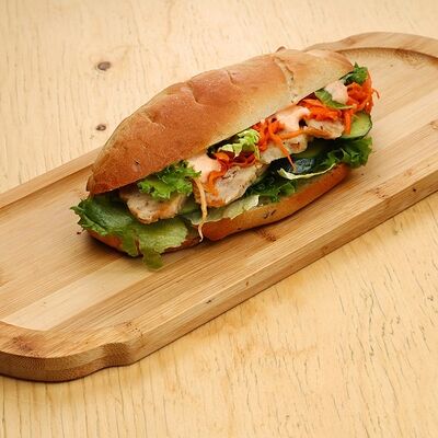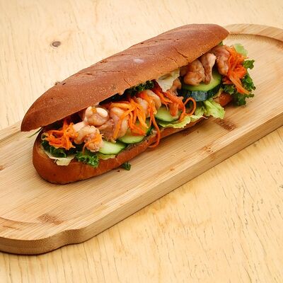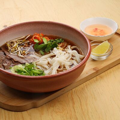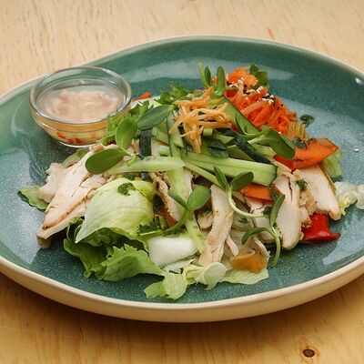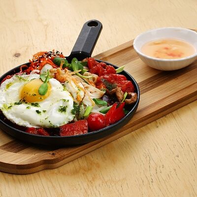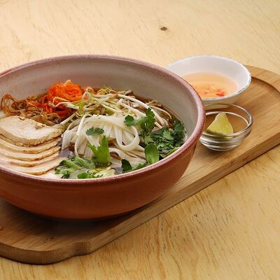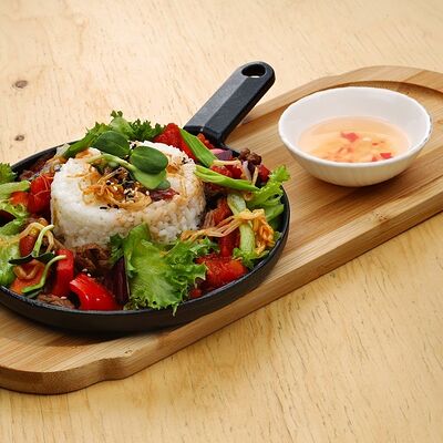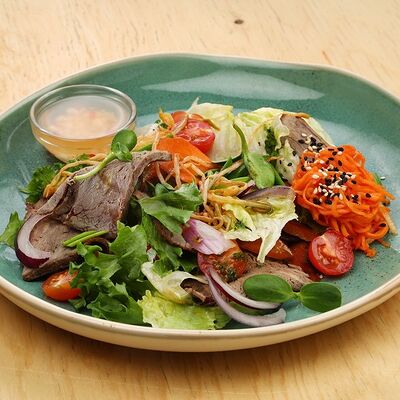 Печеная говядина, помидоры черри, маринованные овощи (морковь и дайкон), обжаренные овощи (перец болгарский, сельдерей, морковь, красный лук). Соус на базе вьетнамских приправ, его мы подаем отдельно
