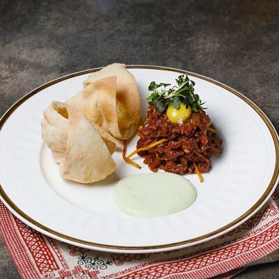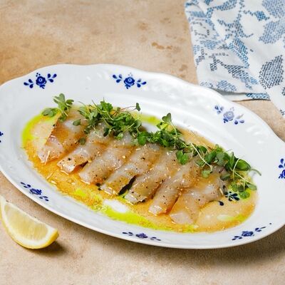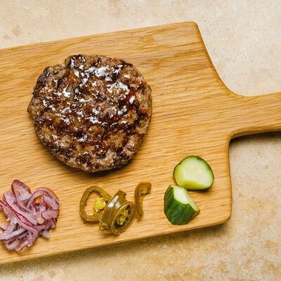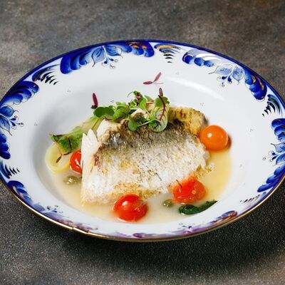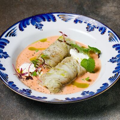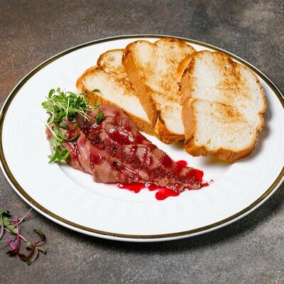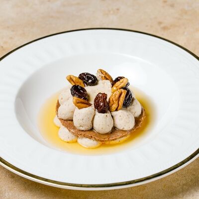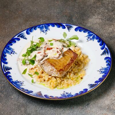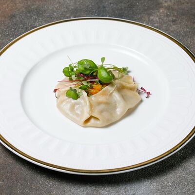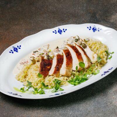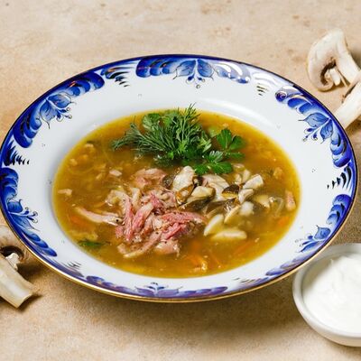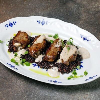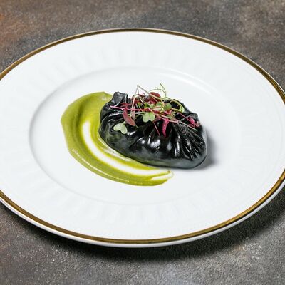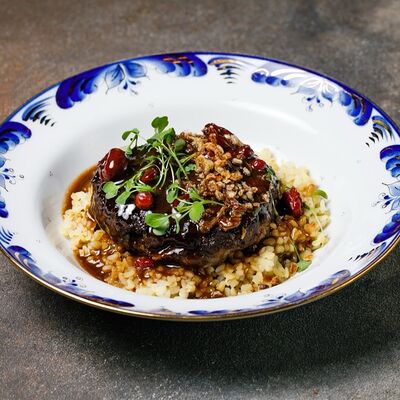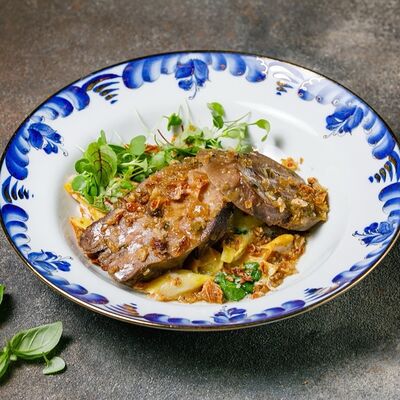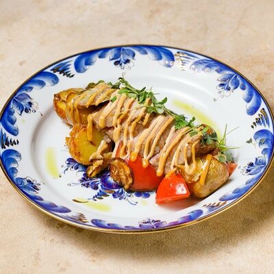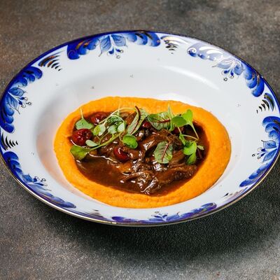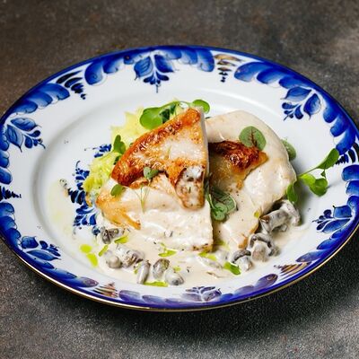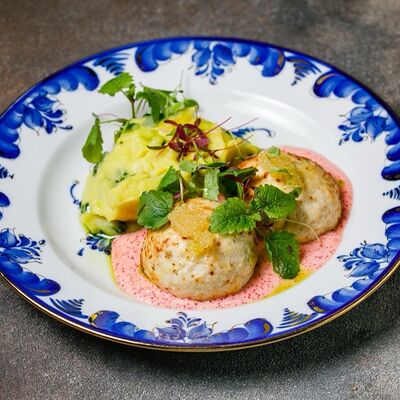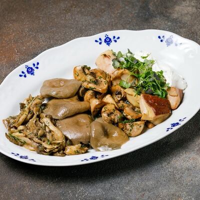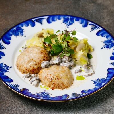 Фарш из индейки, картофельное пюре с вешенками, соус из опят. Украшается грибным маслом и микрозеленью