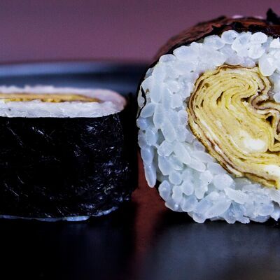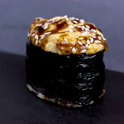 Японский омлет, соус унаги, кунжут, рис, нори. Украшен соусом терияки и белым кунжутом