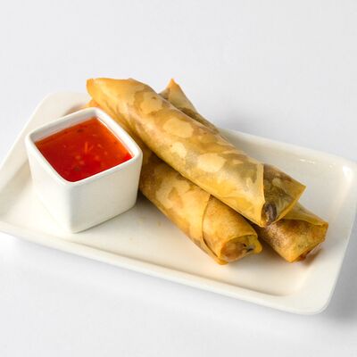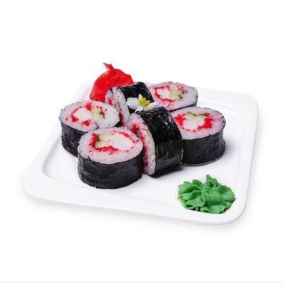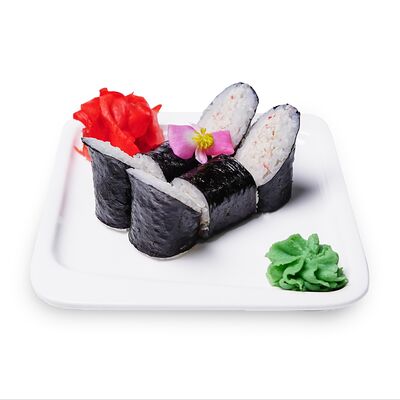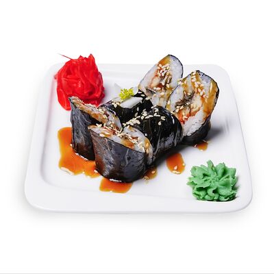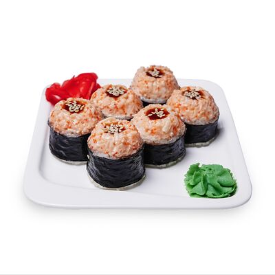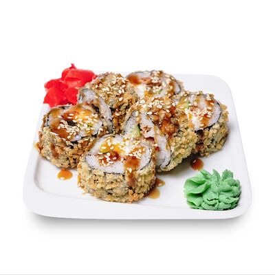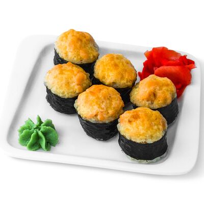 Запеченный ролл с омлетом тамаго и краб-кремом. Сверху аккуратно выкладывается шапочка из краб-крема и яки соуса, добавляется кунжут и унаги соус. Подаются с имбирем и васаби