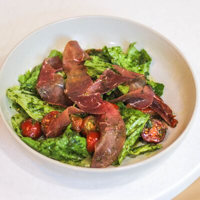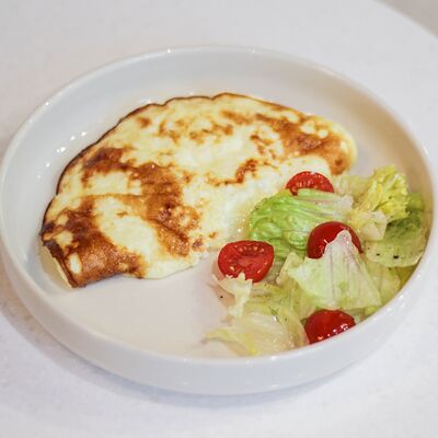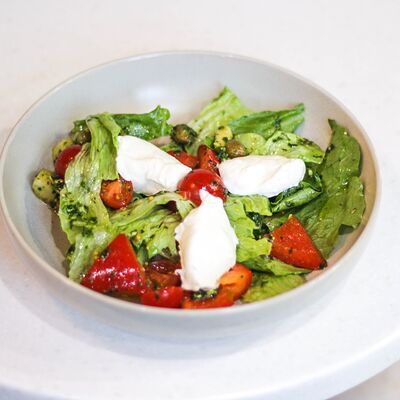 Яйцо, молоко, сыр Фета, сыр Пармезан, сыр моцарелла, салат айсберг, салат романо, помидоры черри, соль