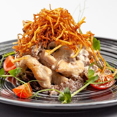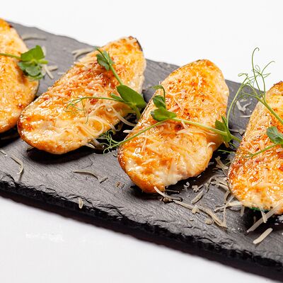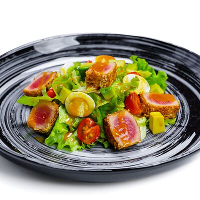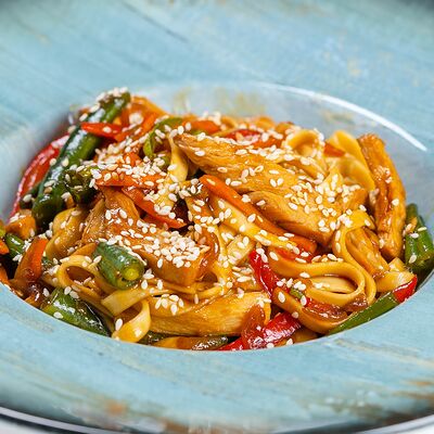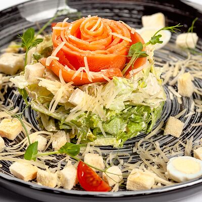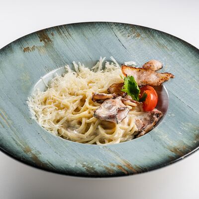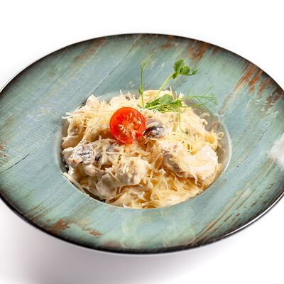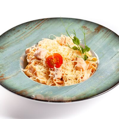 Феттуччине, лосось, помидоры черри, сливки, томатный соус, сыр пармезан, белое вино