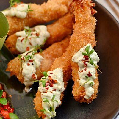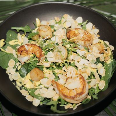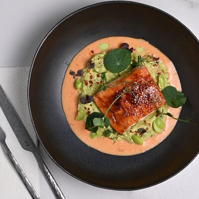 Филе лосося, мусс из авокадо, манго, красная икра