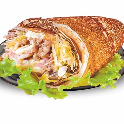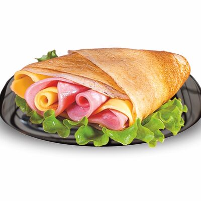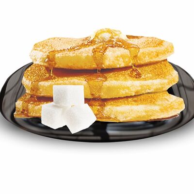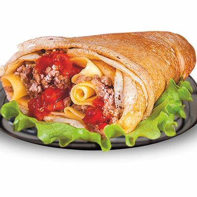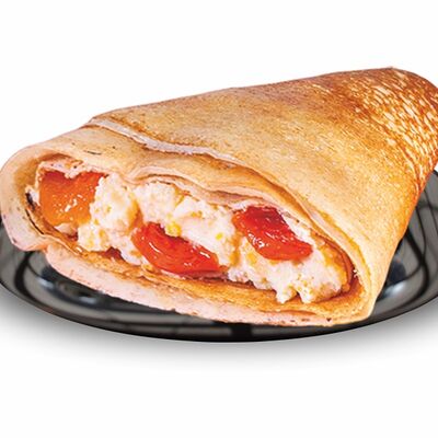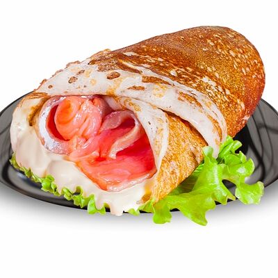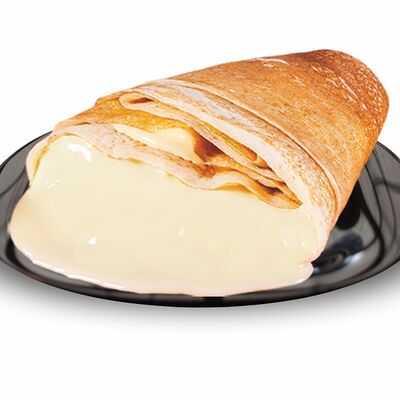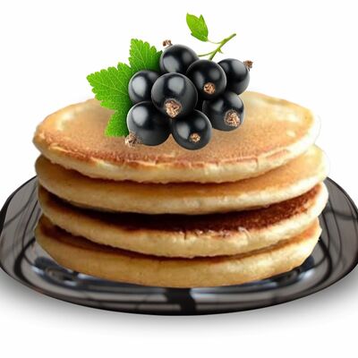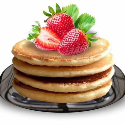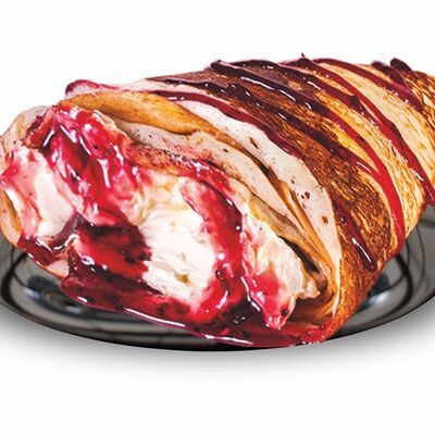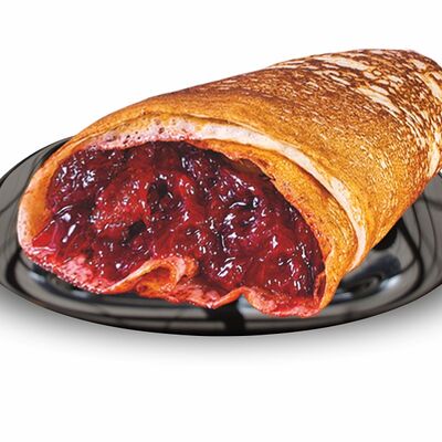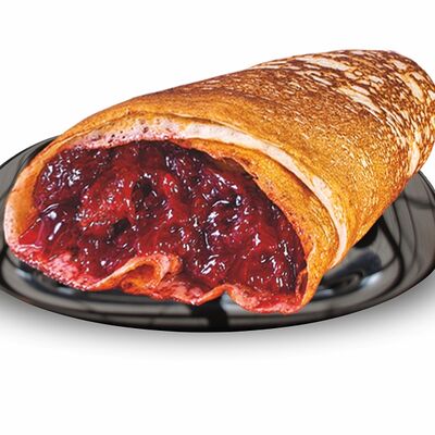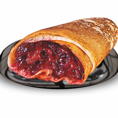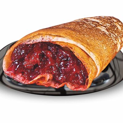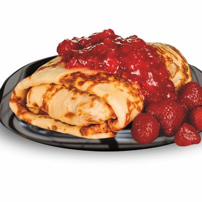 Блинчики (молоко, вода, дрожжи, мука, разрыхлитель, масло растительное, сахар, соль, яйцо), топпинг клубничный