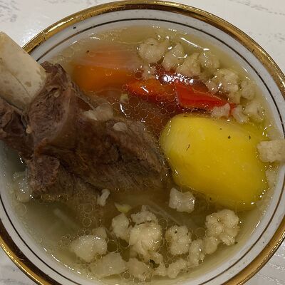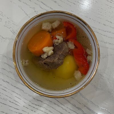 Лапша собственного производства, говядина, болгарский перец красный, лук репчатый, бульончик с говядиной, соль, перец молотый красный