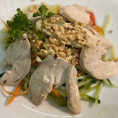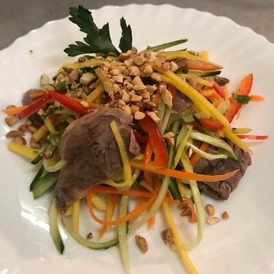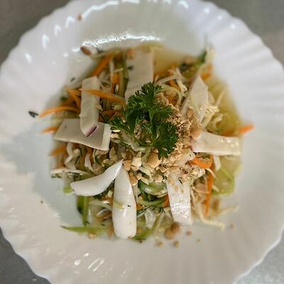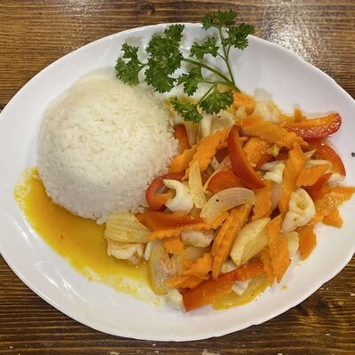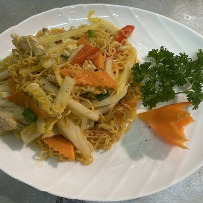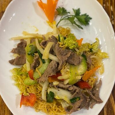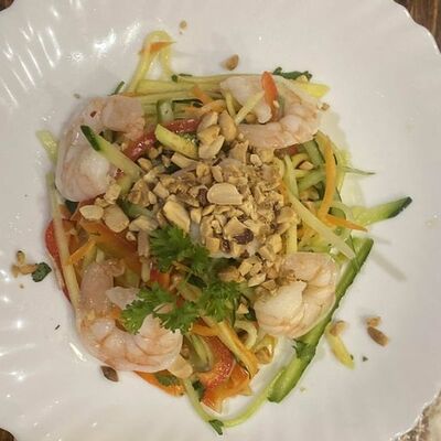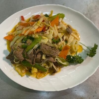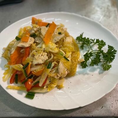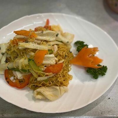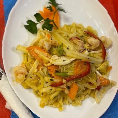 Фунчоза, креветки и кальмары, лук, морковь, китайская капуста, сладкий перец, ростки фасоли