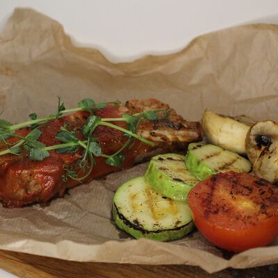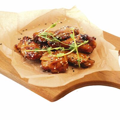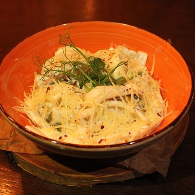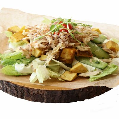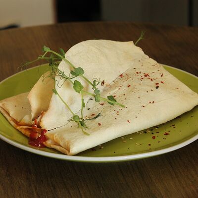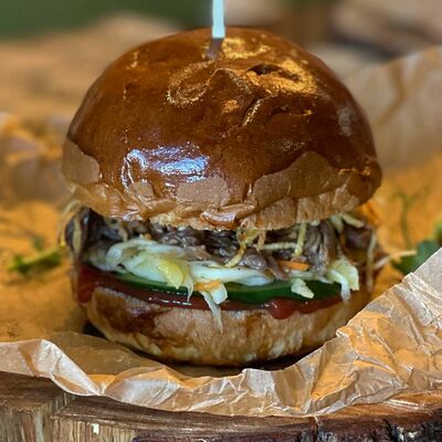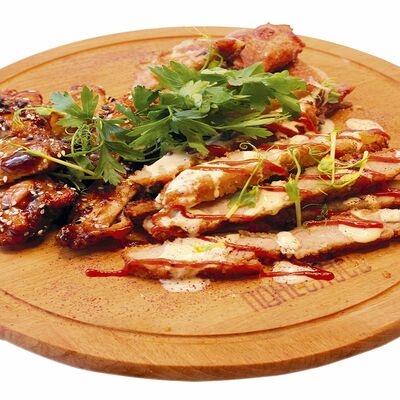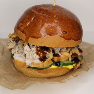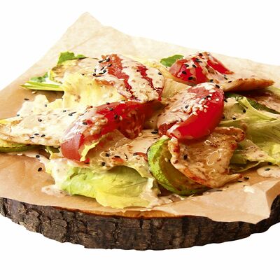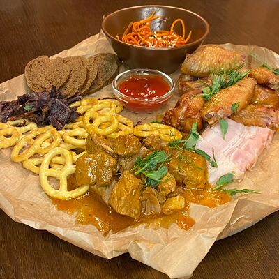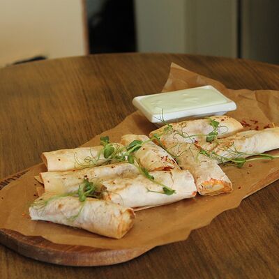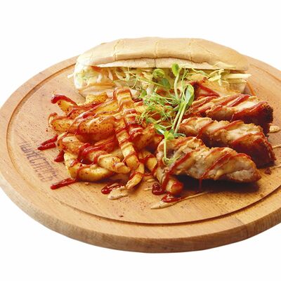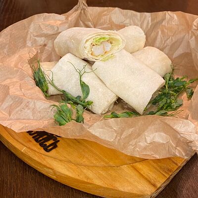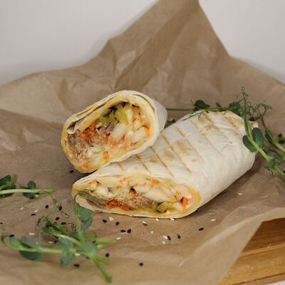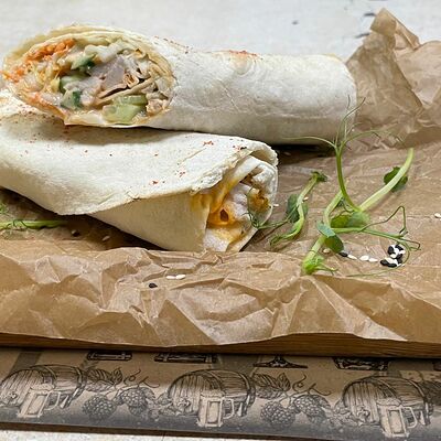 Хрустящий лаваш, маринованные огурцы, томленая свинина, рваная курица, салат из капусты, морковь кимчи, соус спайси, соус BBQ
