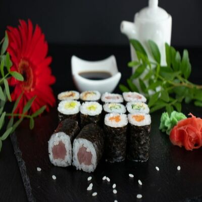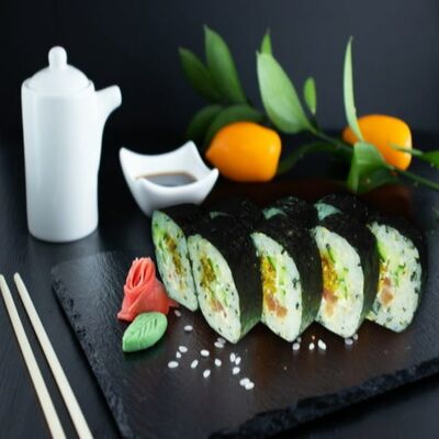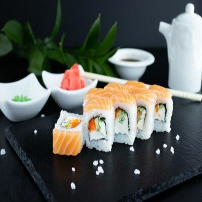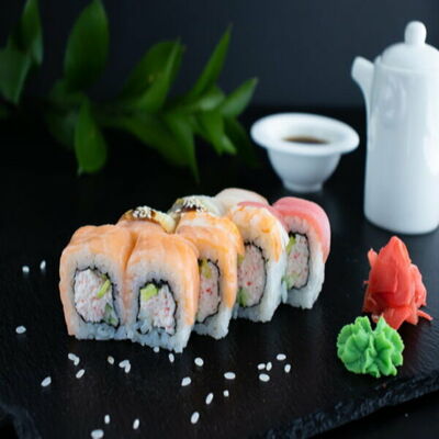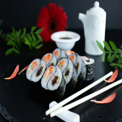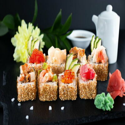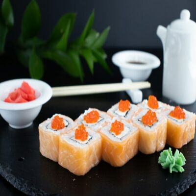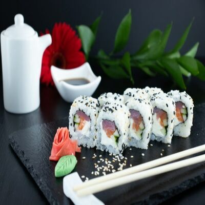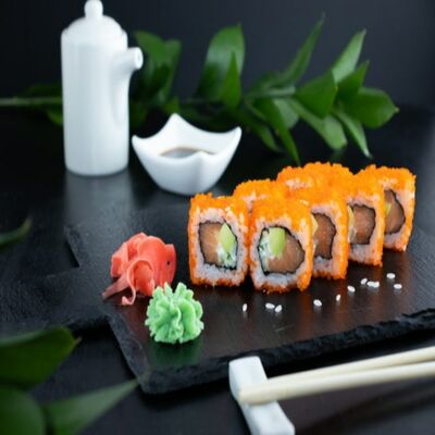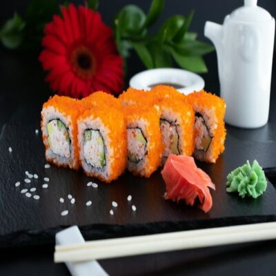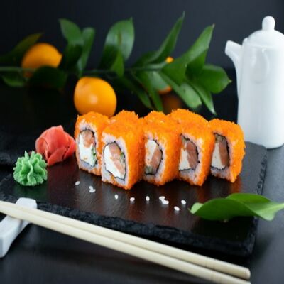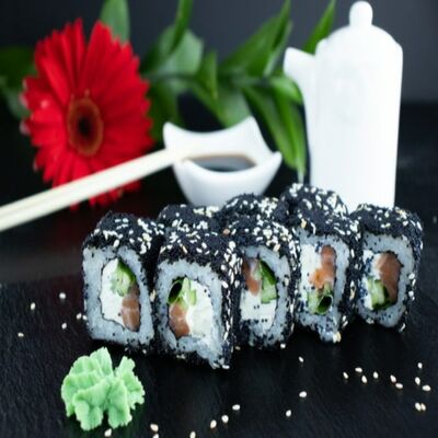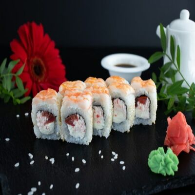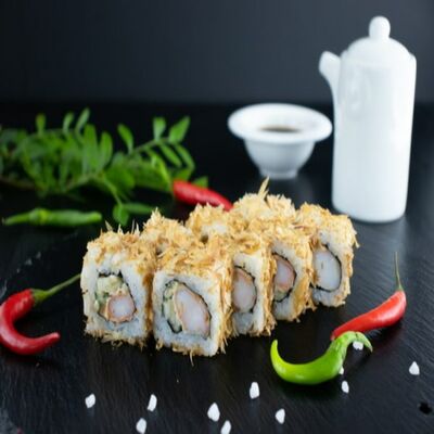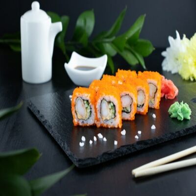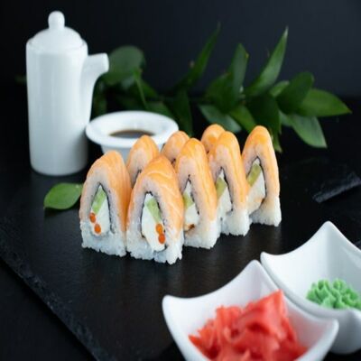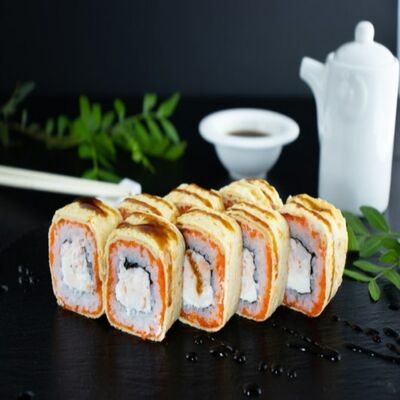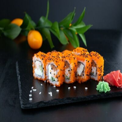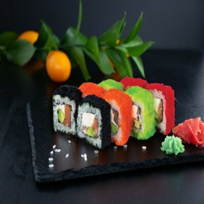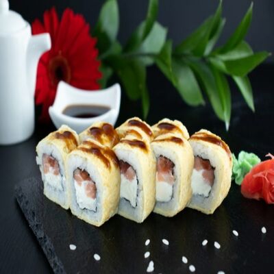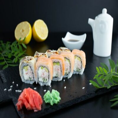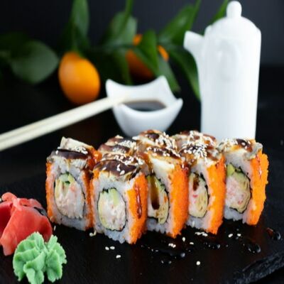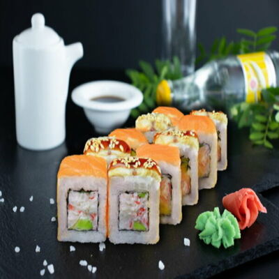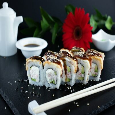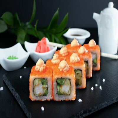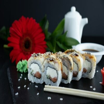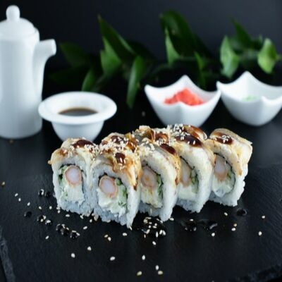 Угорь, окунь, сыр сливочный, огурцы, соус унаги, кунжут