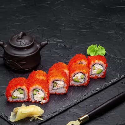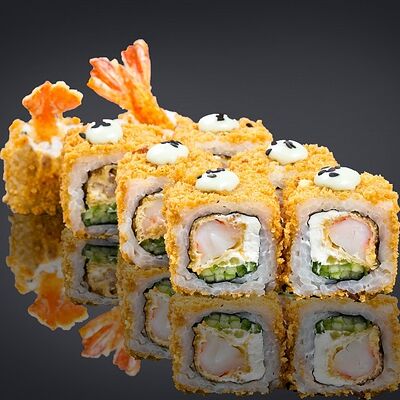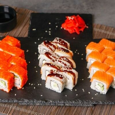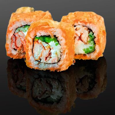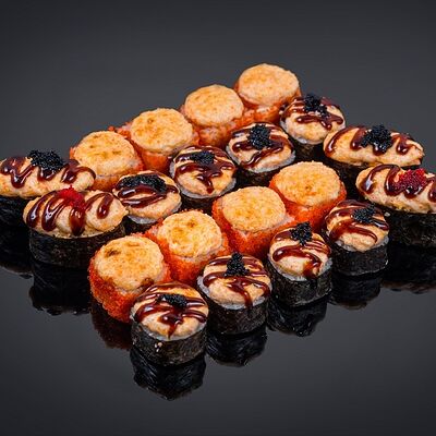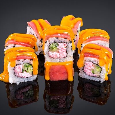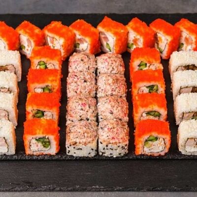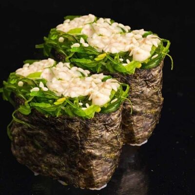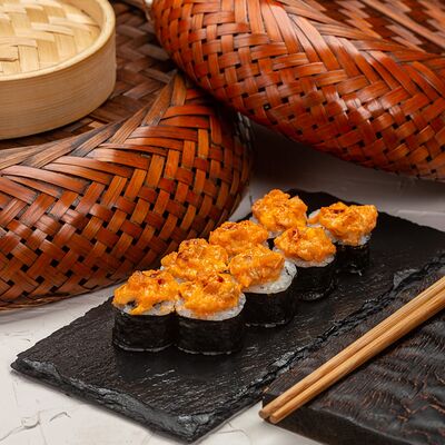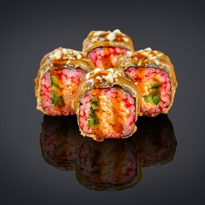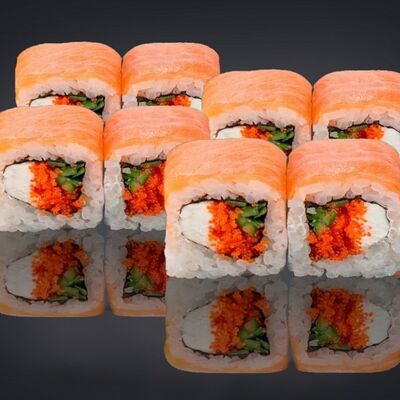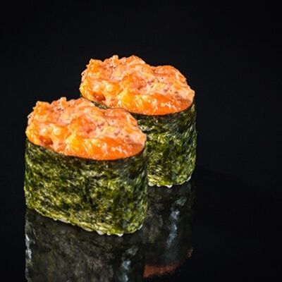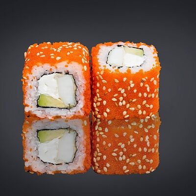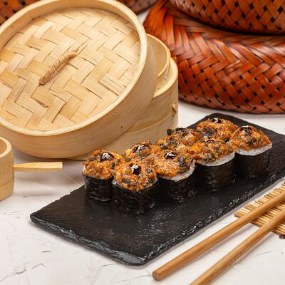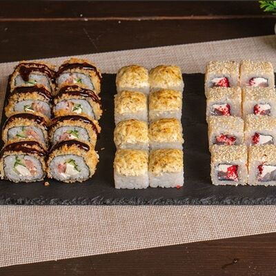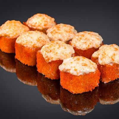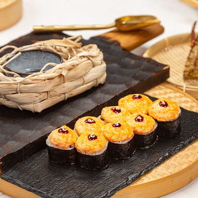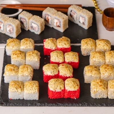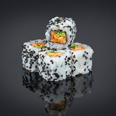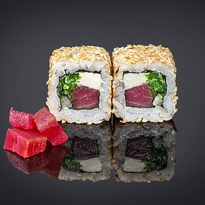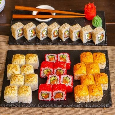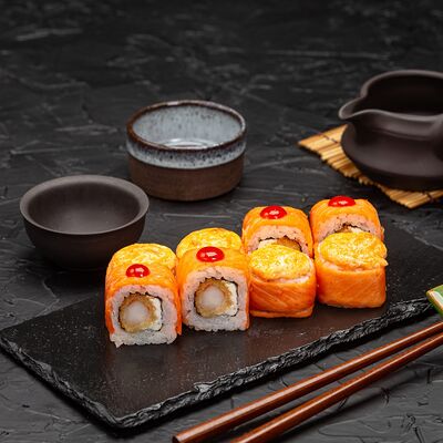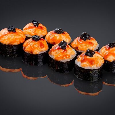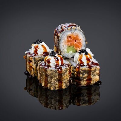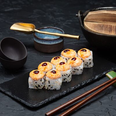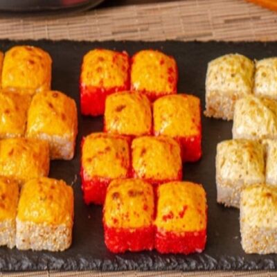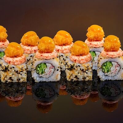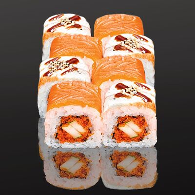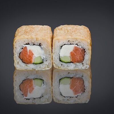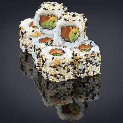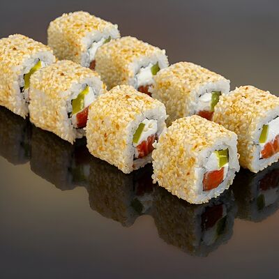 Фирменный рис, сыр креметте, малосолёный лосось, такуан, кунжут