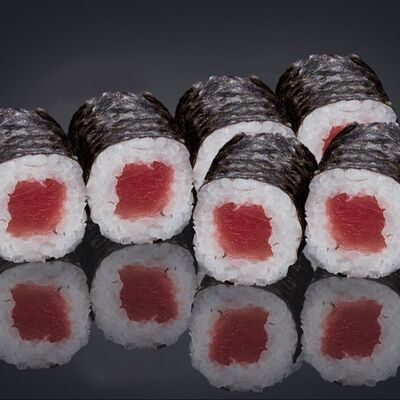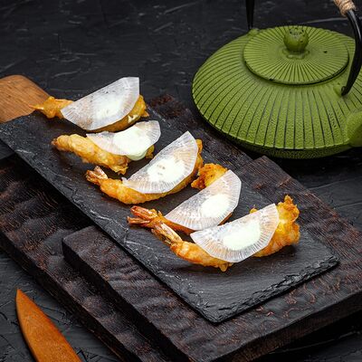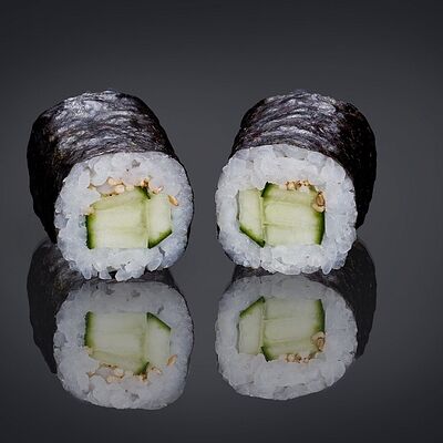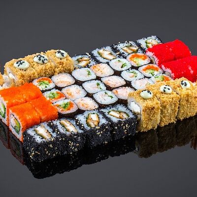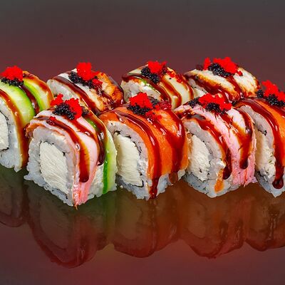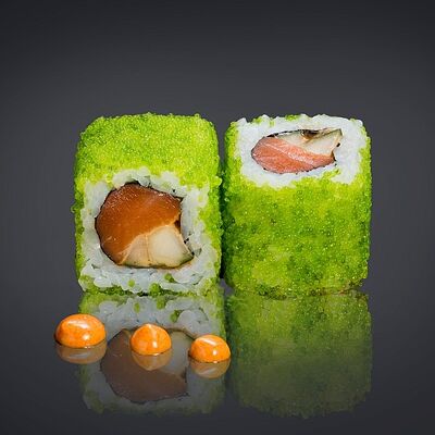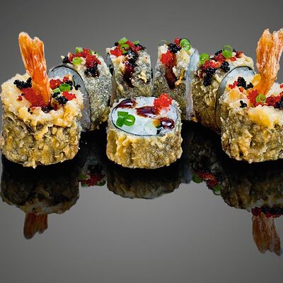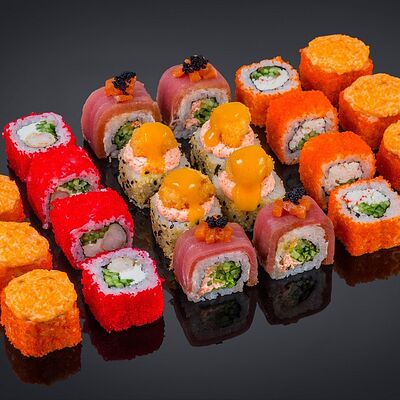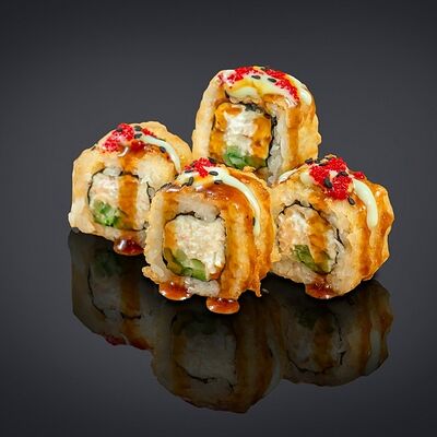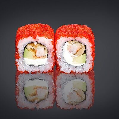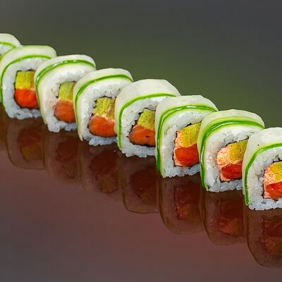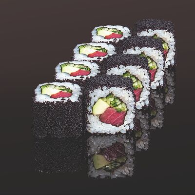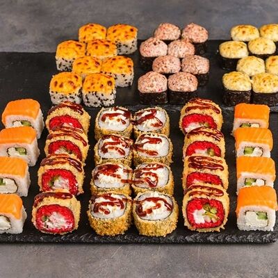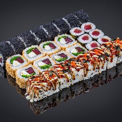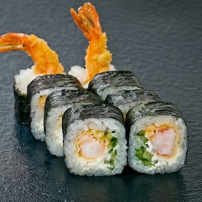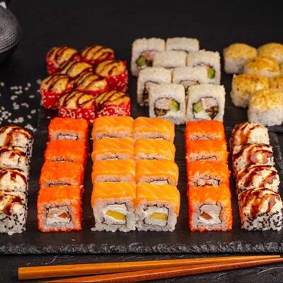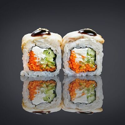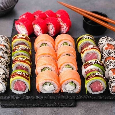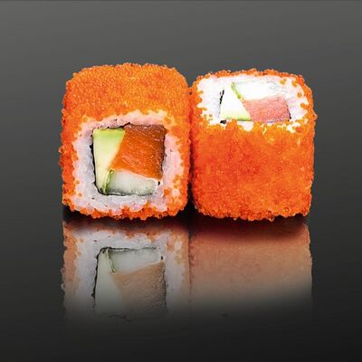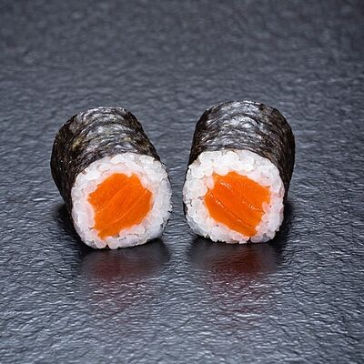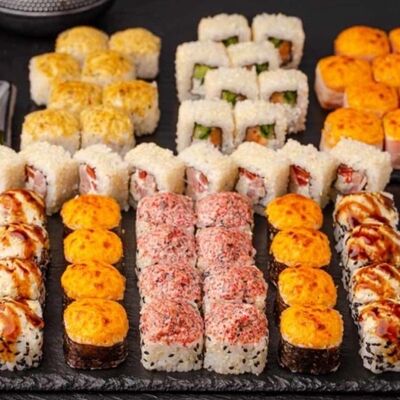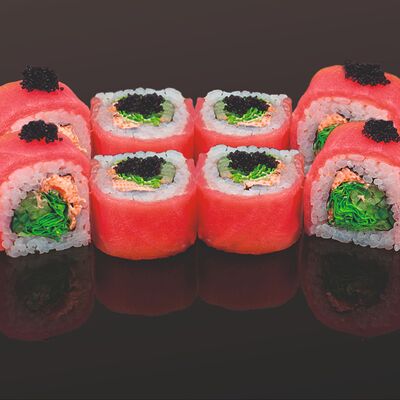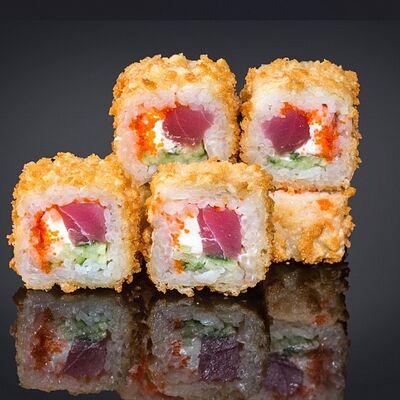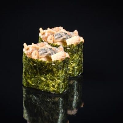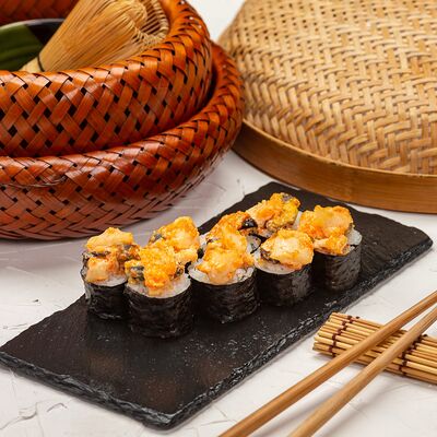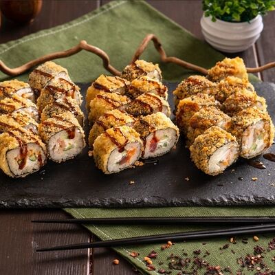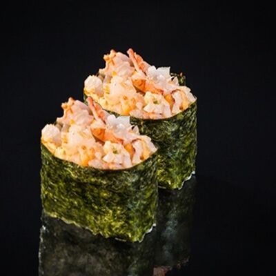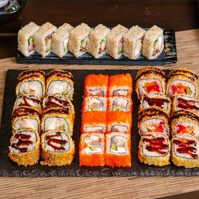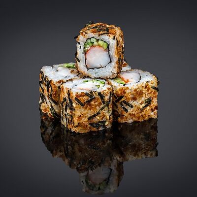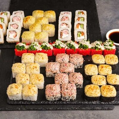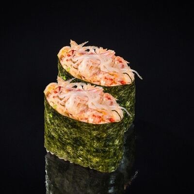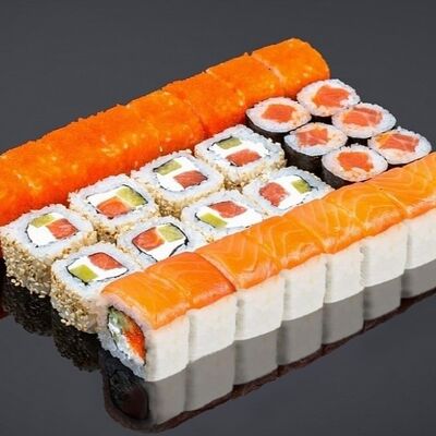 Фирменный рис, сыр креметте, малосолёный лосось, такуан, кунжут