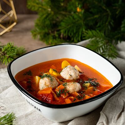 Бульон куриный, картофель, морковь, лук репчатый, помидоры в собственном соку, фрикадельки рыбные, специи, зелень