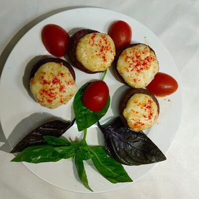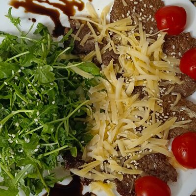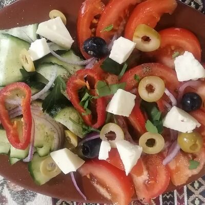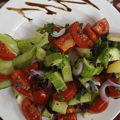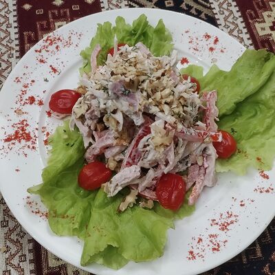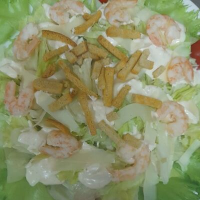 Салат айсберг, креветки, сухари, черри, соус специальный