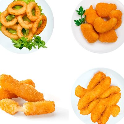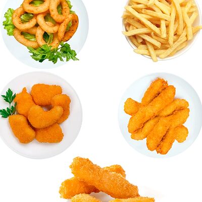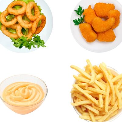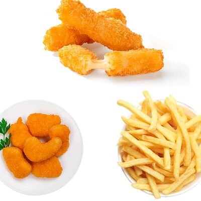 Картошка фри, стрипсы (3 шт.), наггетсы (4 шт.), луковые кольца (5 шт.)