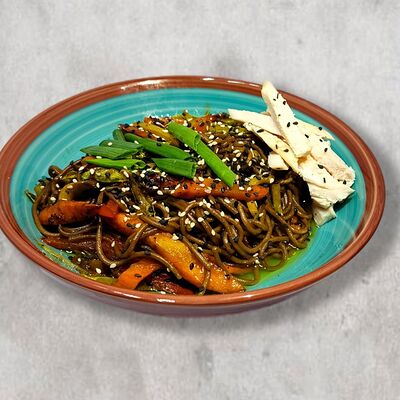 Цукини, лук, салат китайский, перец болгарский, чеснок, кинза морковь, лук зеленый, соус, терияки