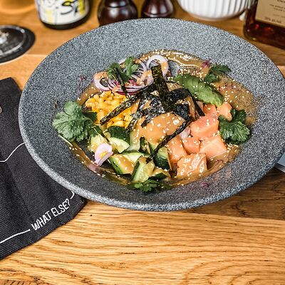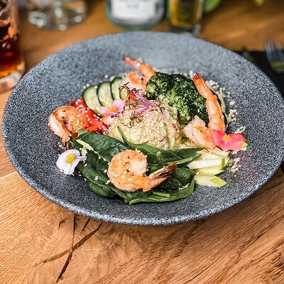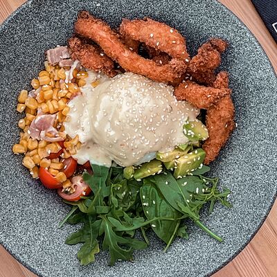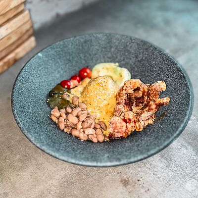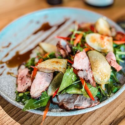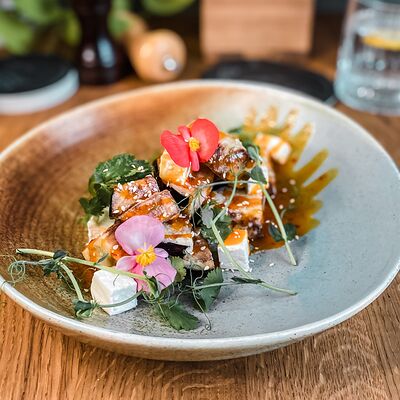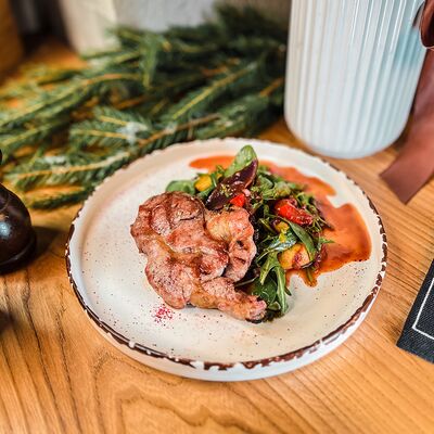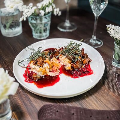Оливье в паназиатском стиле с глазированным в унаги говяжьим языком, сеном из лука порея и дикой клюквой
