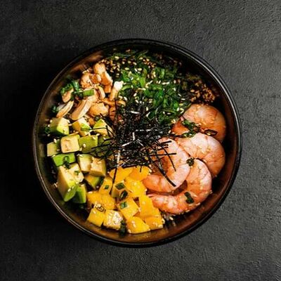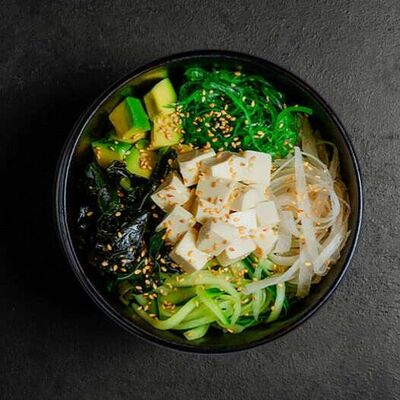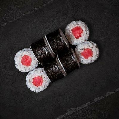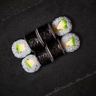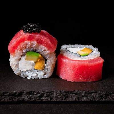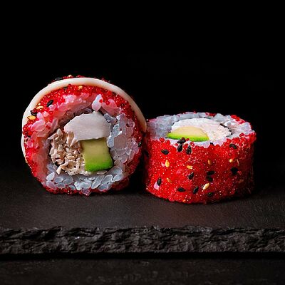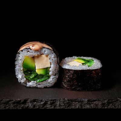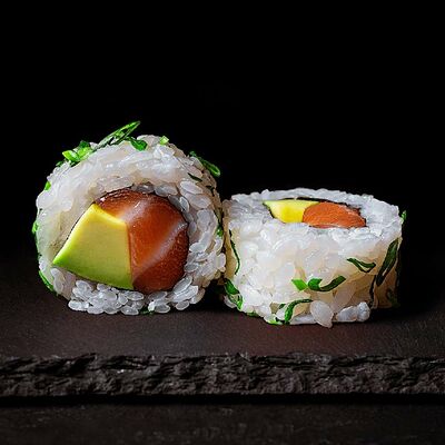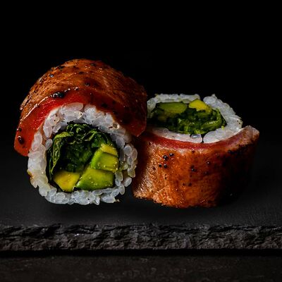 Рис, салат айсберг, авокадо, огурец, тунец, соус перечный. Ролл опаливается горелкой