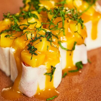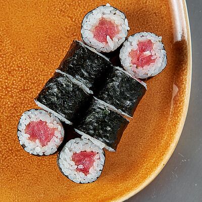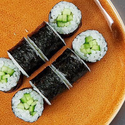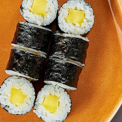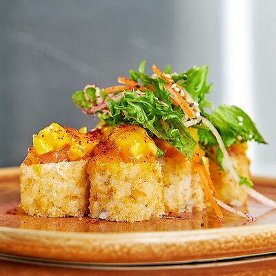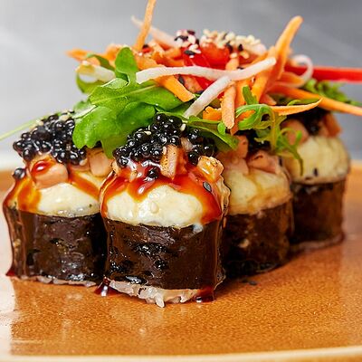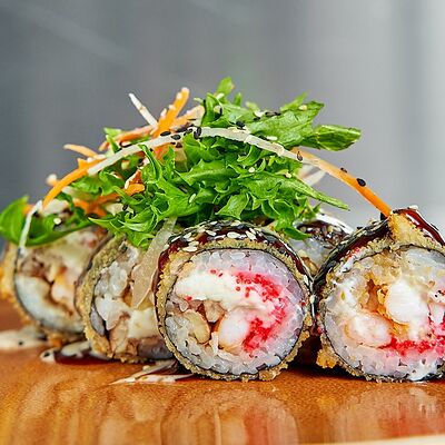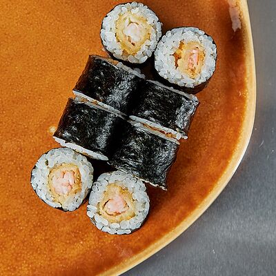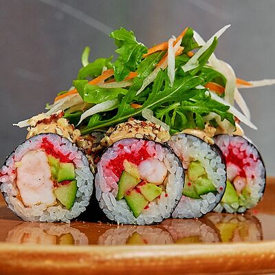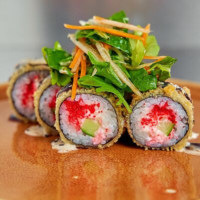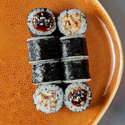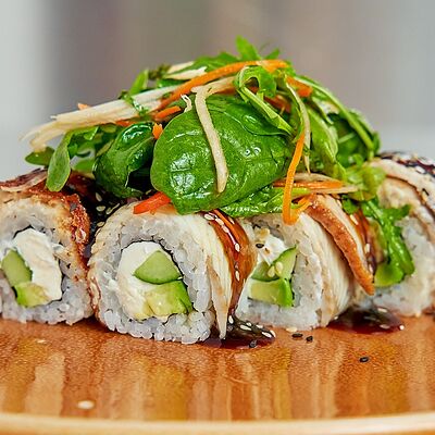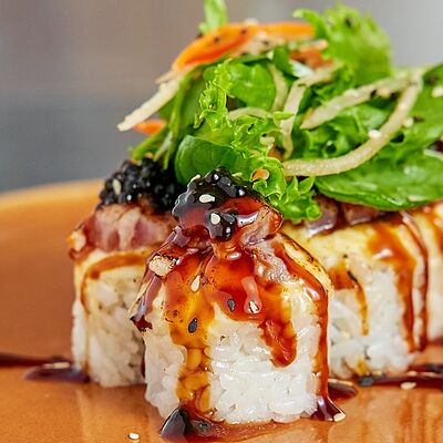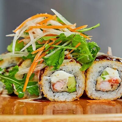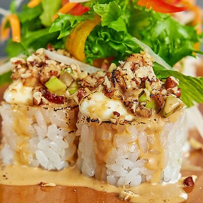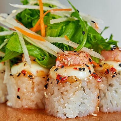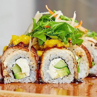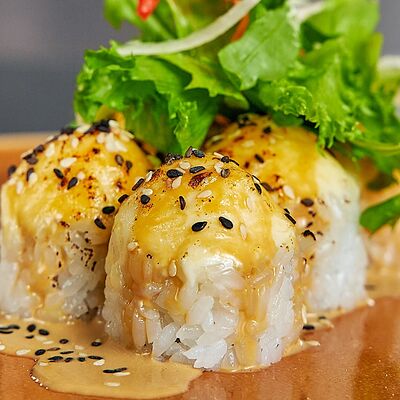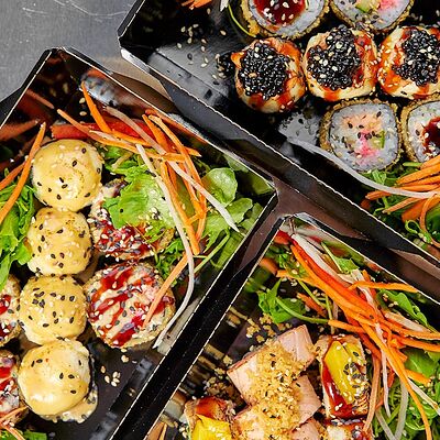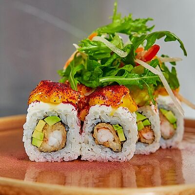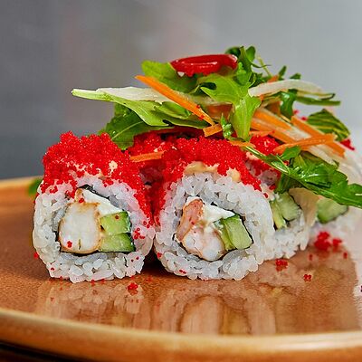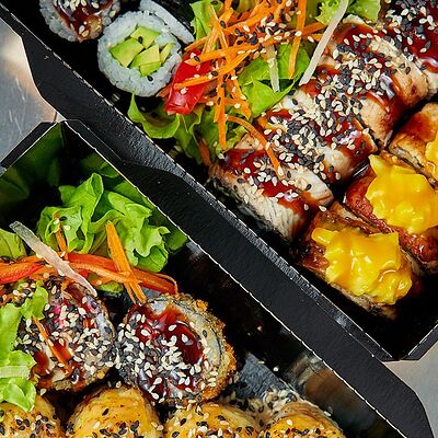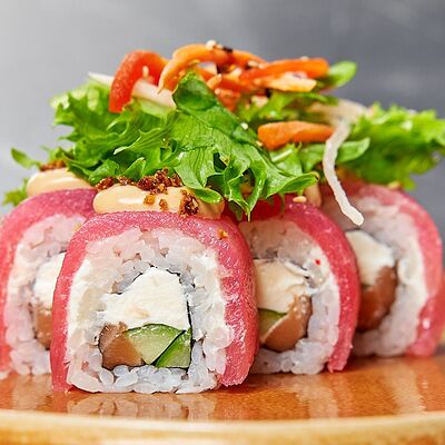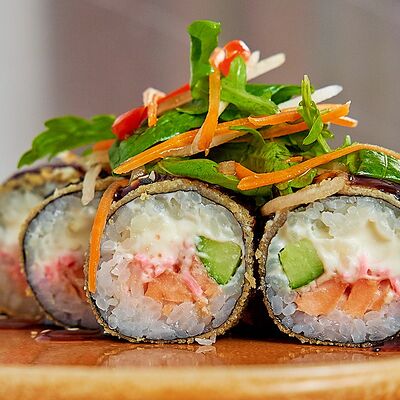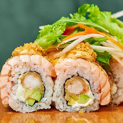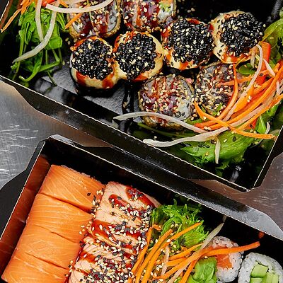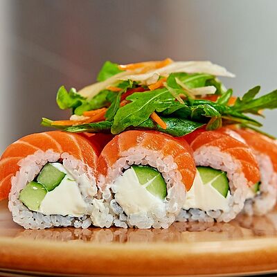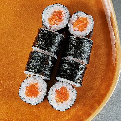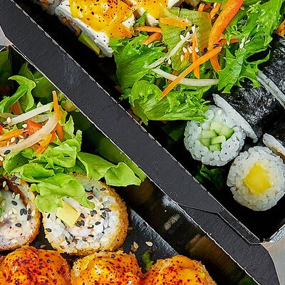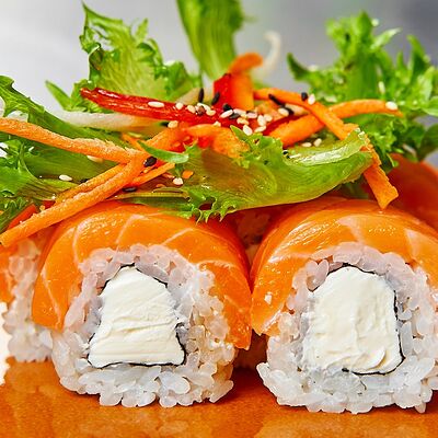 Маки с лососем (4 шт.), маки с огурцом (4 шт.), Филадельфия (4 шт.), опаленный ролл с лососем (4 шт.), темпурный ролл с лососем (4 шт.), запеченный ролл с лососем (4 шт.), имбирь, васаби, соевый соус, микс-салат